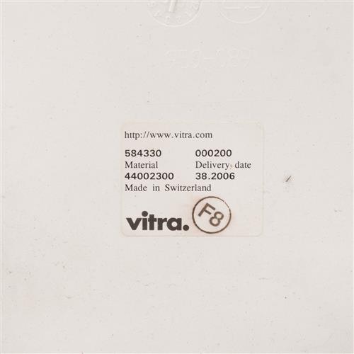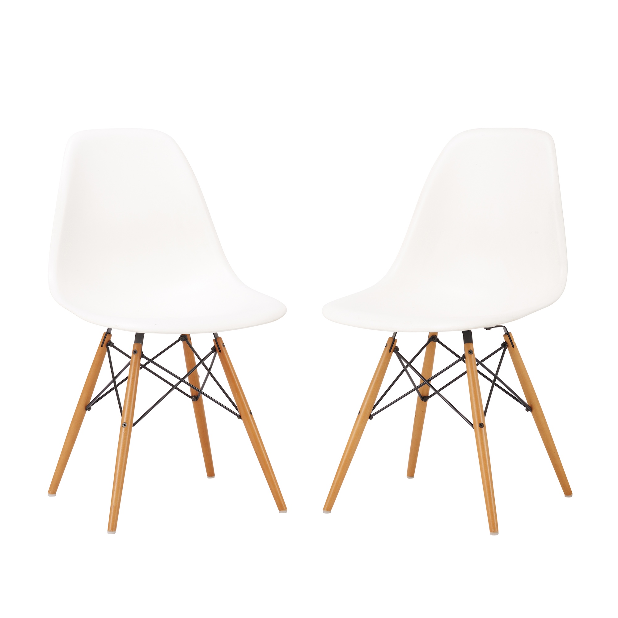 White moulded plastic seat shells on wooden base. Vitra mark to undersides.
