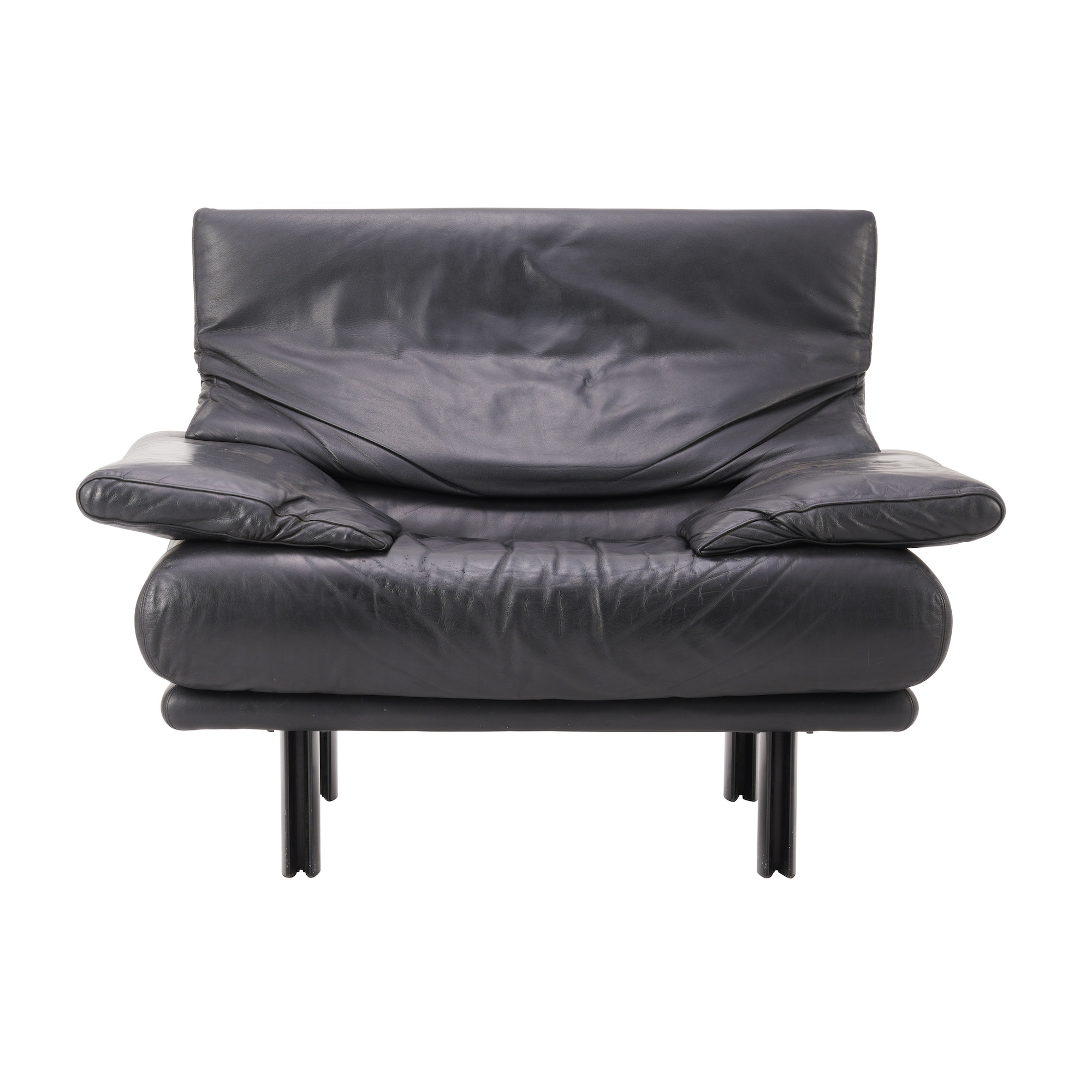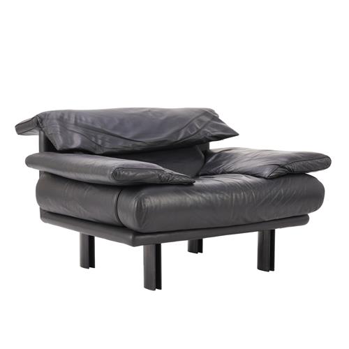 In black leather upholstery on enamelled steel frame. Adjustable headrest. Label present under seat cushion.