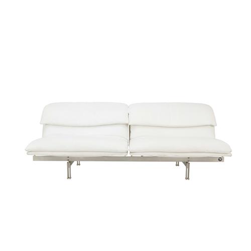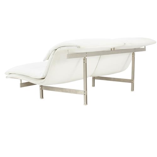 Perforated white leather upholstered curved cushioned seat and back rest on exposed steel frame. Retains manufacturer details.