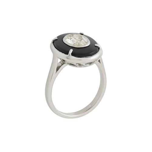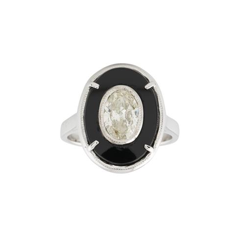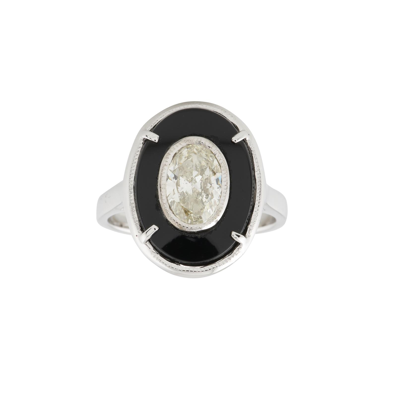 Of plaque design, centring a counter bezel-set oval cut diamond weighing approximately 1.01 carats, within an oval onyx plaque, size M 1/2, gross weight approximately 6.13 grams.