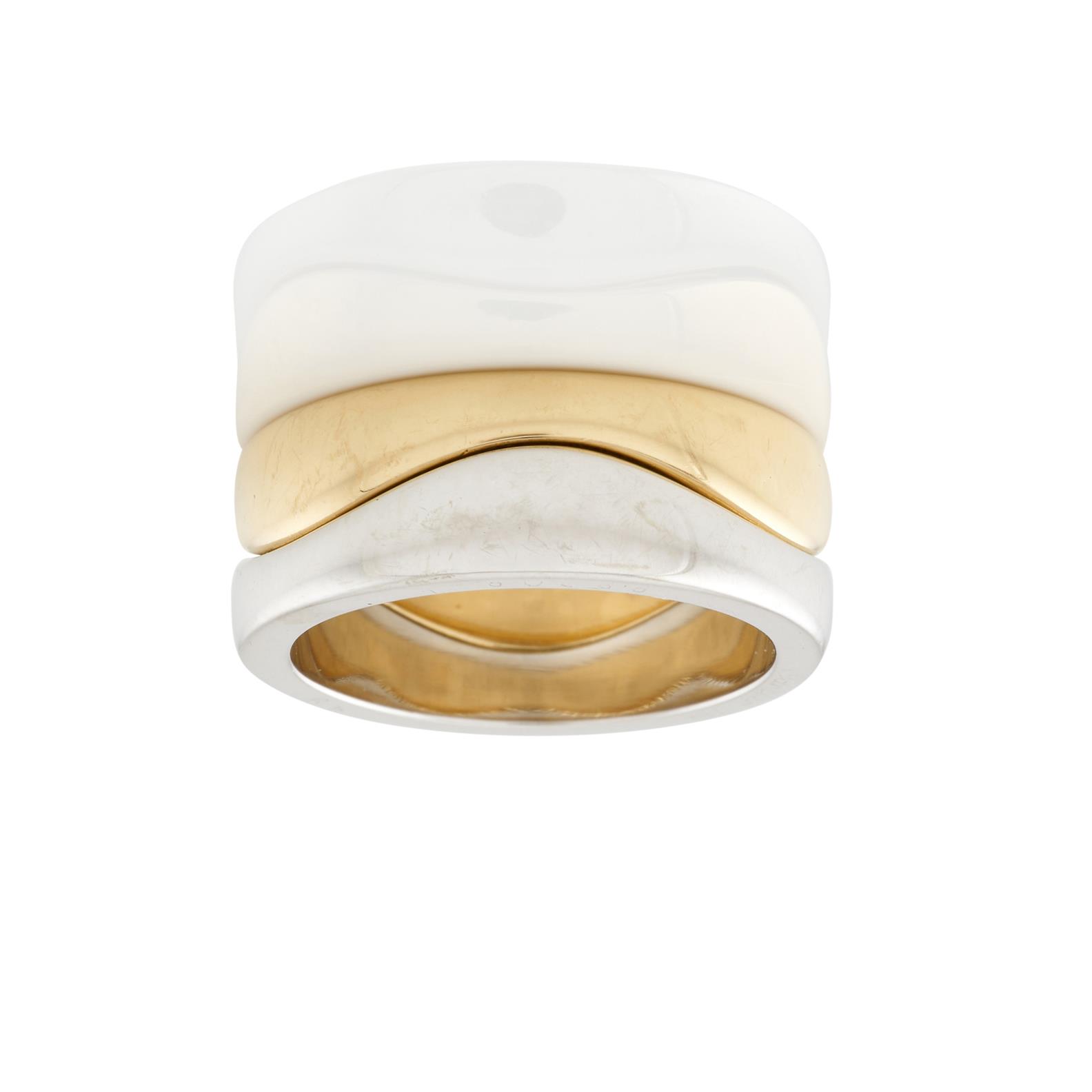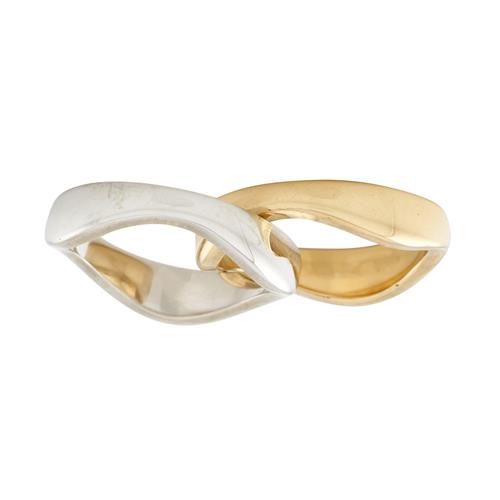 Designed with straight outer edges and wave shaped interiors to fit together and worn as one piece, one band crafted in 18ct yellow gold, the other in 18ct white gold, ring size I,