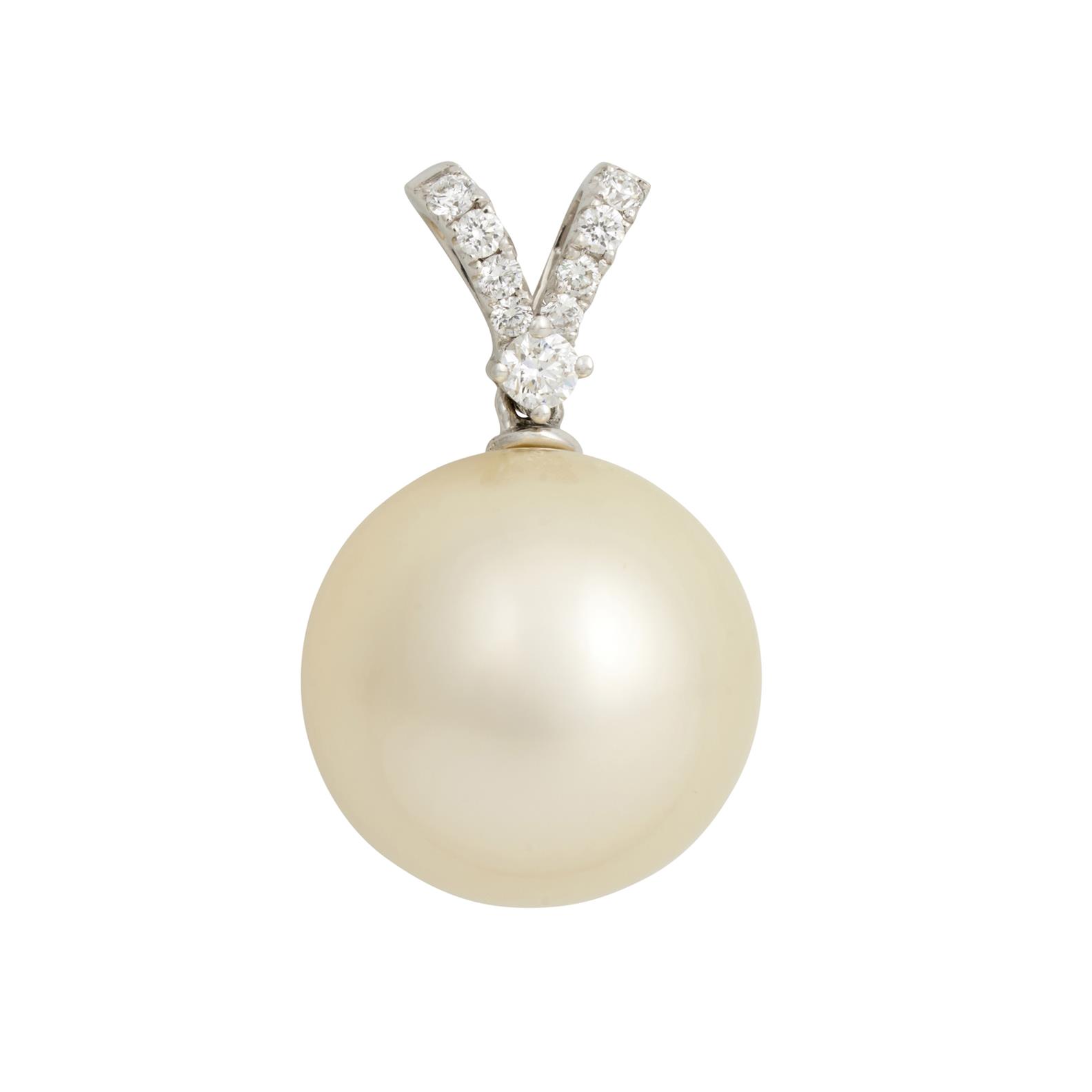 Featuring a full round cream colour South Sea pearl of 13.8 mm suspended from a diamond set split bail, the diamonds together weighing approximately 0.15ct. length approximately 22mm, gross weight approximately 3.8 grams.