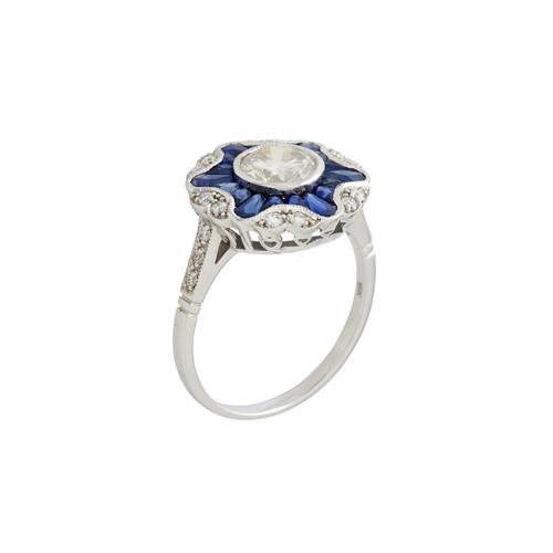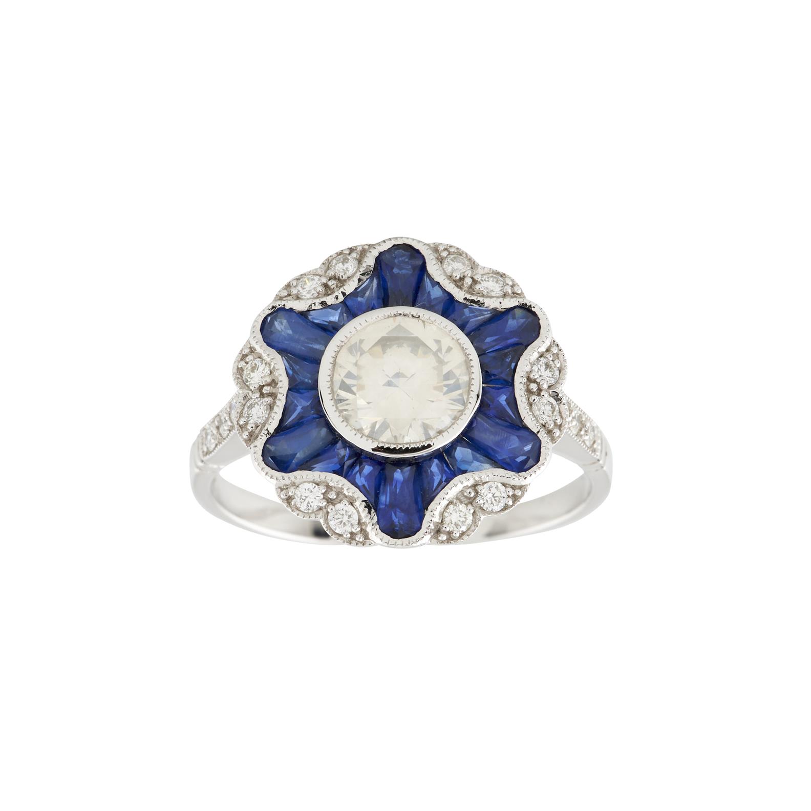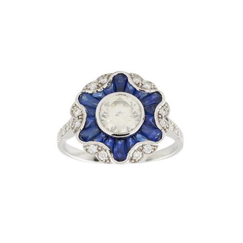 In the Art-Deco style, centrally bezel set with a round brilliant cut diamond weighing approximately1.06 carats, surrounded by custom French cut sapphires together totalling 1.80 carats, and further round brilliant cut diamonds together totalling 0.25 carats, size N, gross weight approximately 3.91 grams.