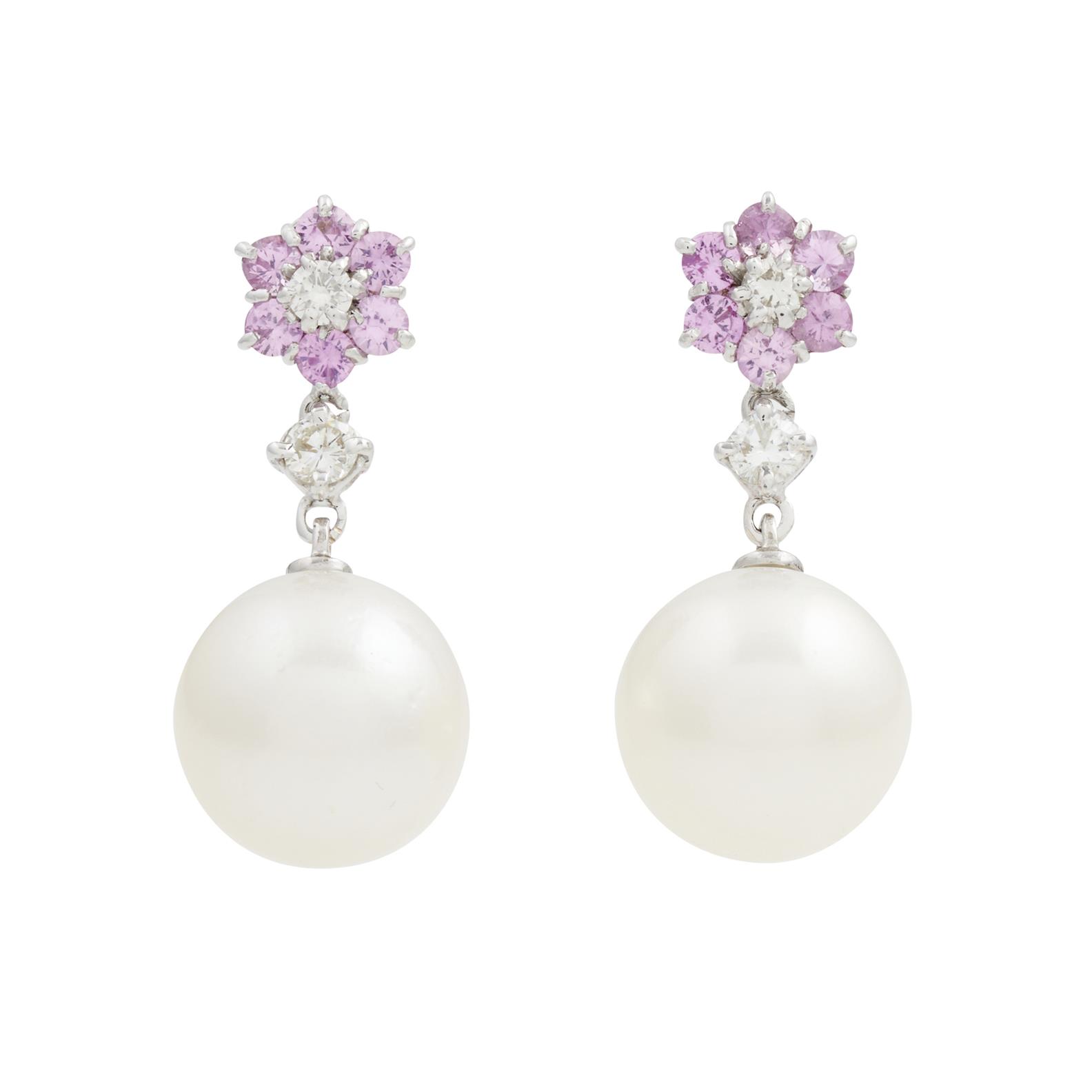 Each earring comprising a round pearl of silver pink hues measuring approximately 14.7mm, suspended below a pink sapphire and diamond cluster surmount, the pink sapphires together weighing approximately 0.85 carats, to post and butterfly fittings, length approximately 20mm, gross weight approximately 12.3 grams.