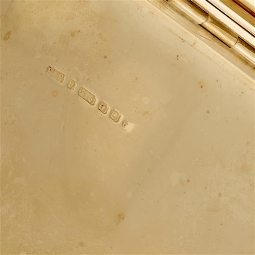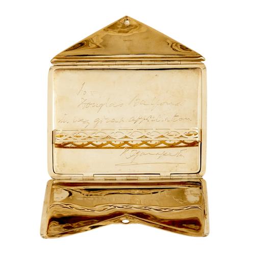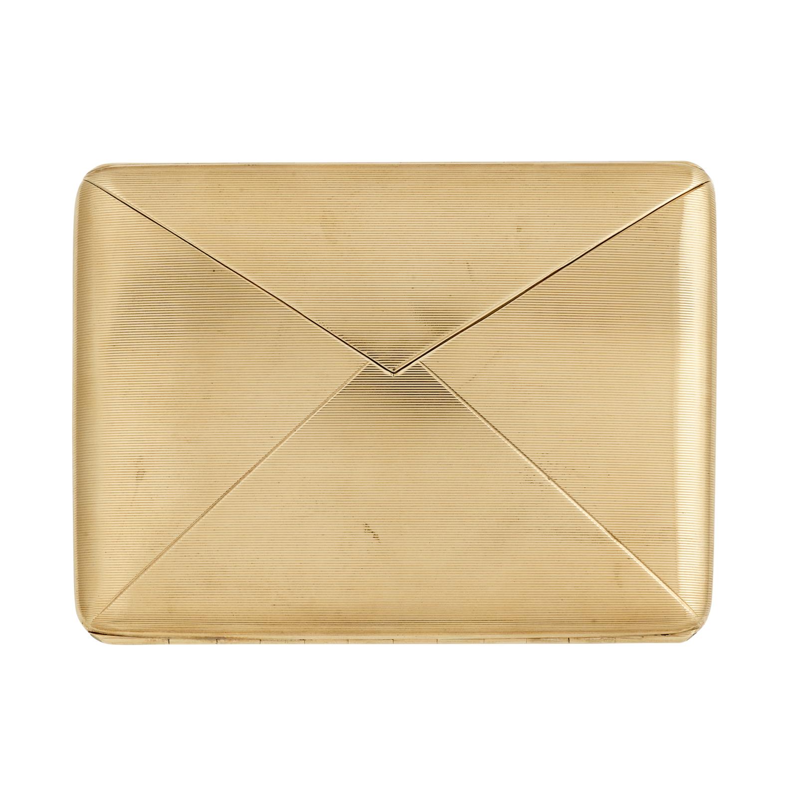 Designed as an envelope of textured finish, the sprung case opening to reveal an engraved inscription to the interior 'To Douglas Balfour in very great appreciation of your work with my horses', hallmarked Birmingham 1938,