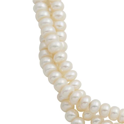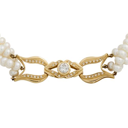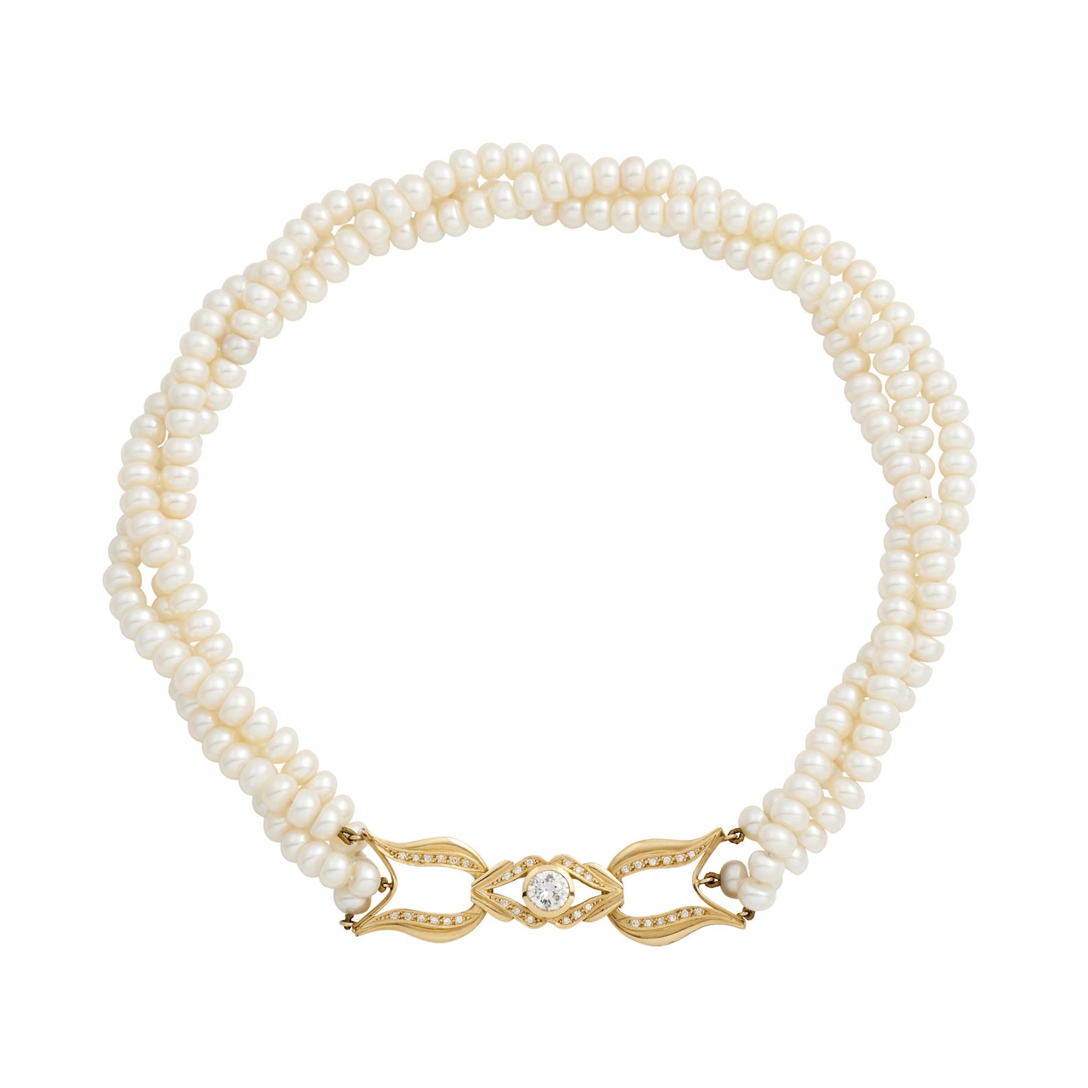 Comprising three rows of ovoid shaped cream-white freshwater pearls affixed to an articulated diamond feature clasp centring on bezel-set round brilliant cut suspended within a lozenge shape central motif with outer ornamental horseshoe shaped brackets adorned with grain set round brilliant cut diamonds,