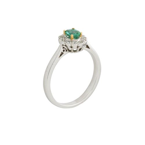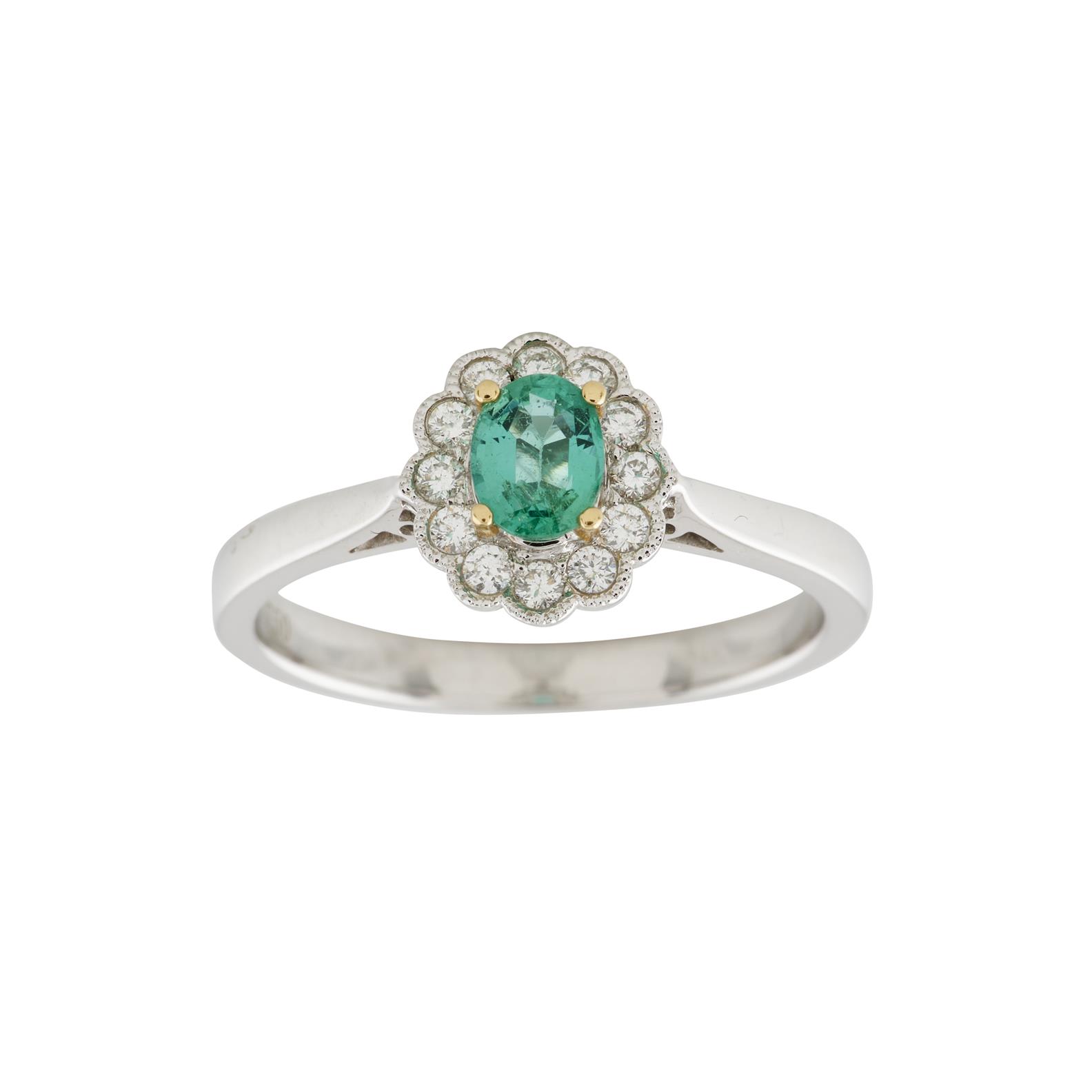 Of cluster design comprising a claw set natural oval emerald surrounded by round brilliant cut diamonds, size M,