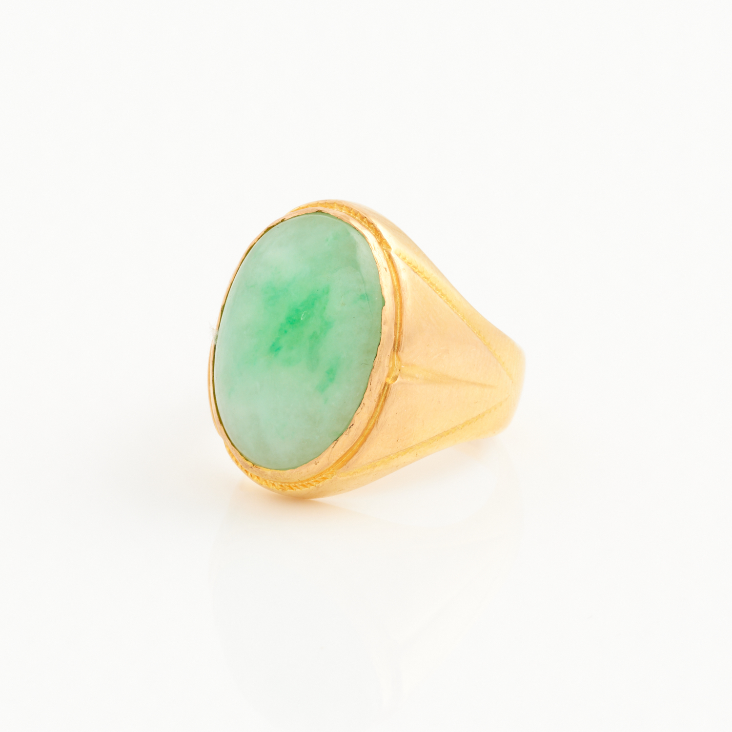 A GREEN STONE RING IN 22CT GOLD, SIZE O, 12.5GMS