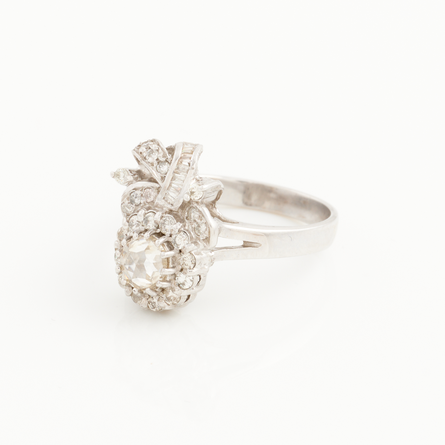 A DIAMOND RING IN 14CT WHITE GOLD, THE CENTRE DIAMOND WEIGHING APPROXIMATELY 0.46CTS, SIZE N, 3.9GMS