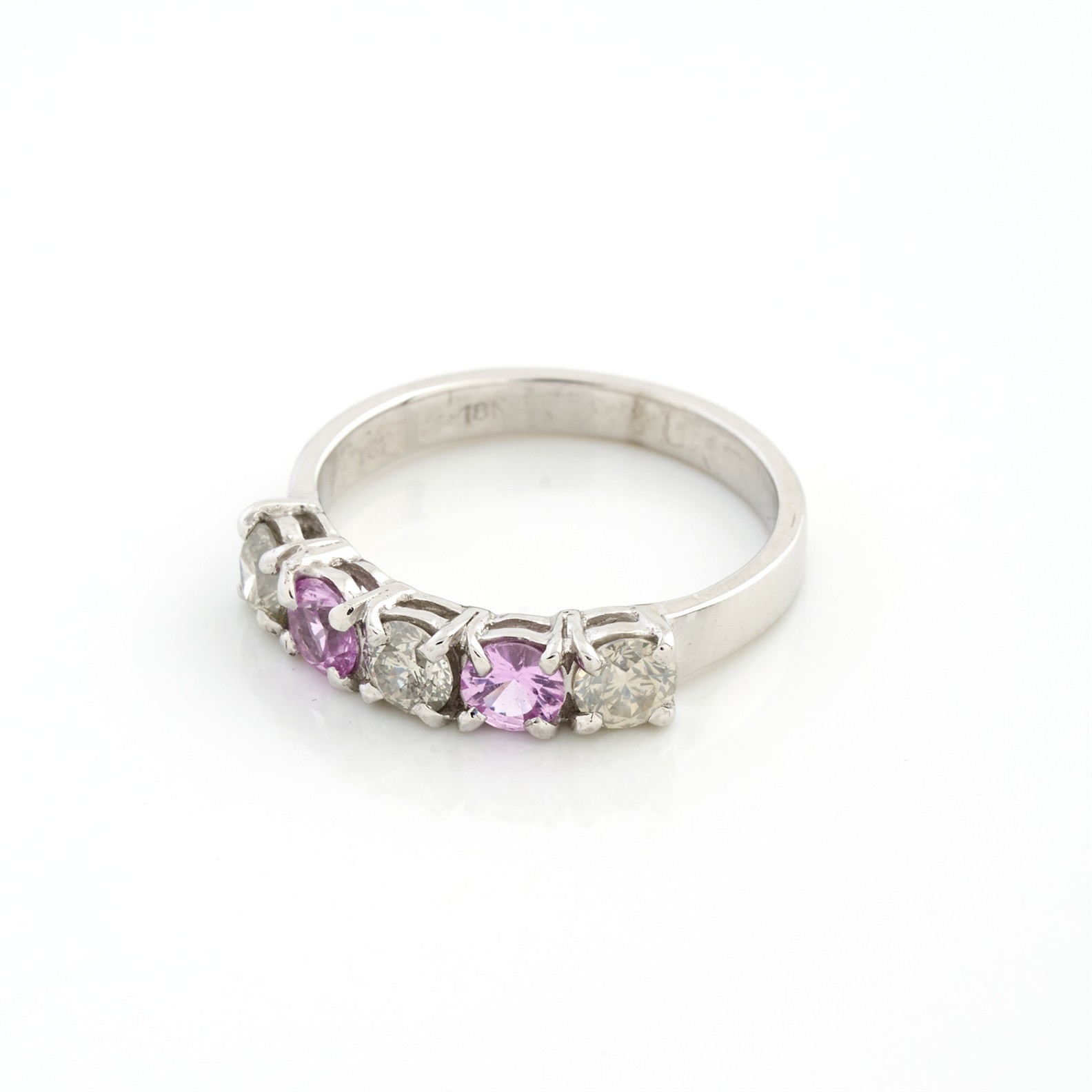 A DIAMOND AND PINK SAPPHIRE RING IN 18CT WHITE GOLD, SIZE M1/2, 3.4GMS