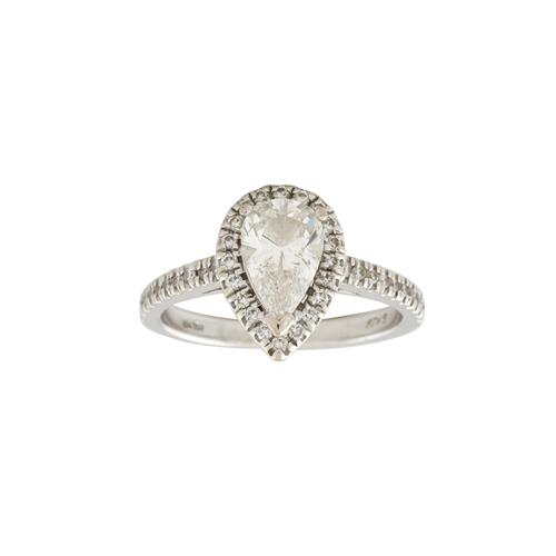 18ct white gold ring centring on a pear shape diamond of 1.32 carats surrounded by a micro claw set halo of small brilliant diamonds to a cathedral shoulder also diamond set to a parallel width band of 2.3 mm width. ring size P1/2 , gross weight approximately 6.4 grams.