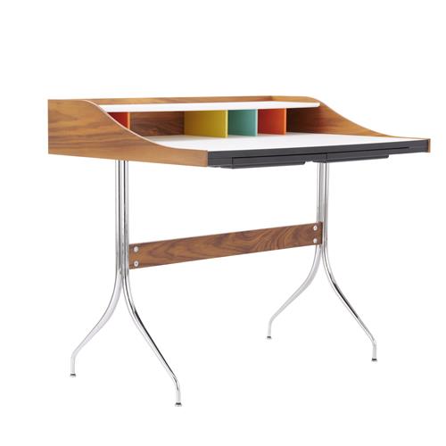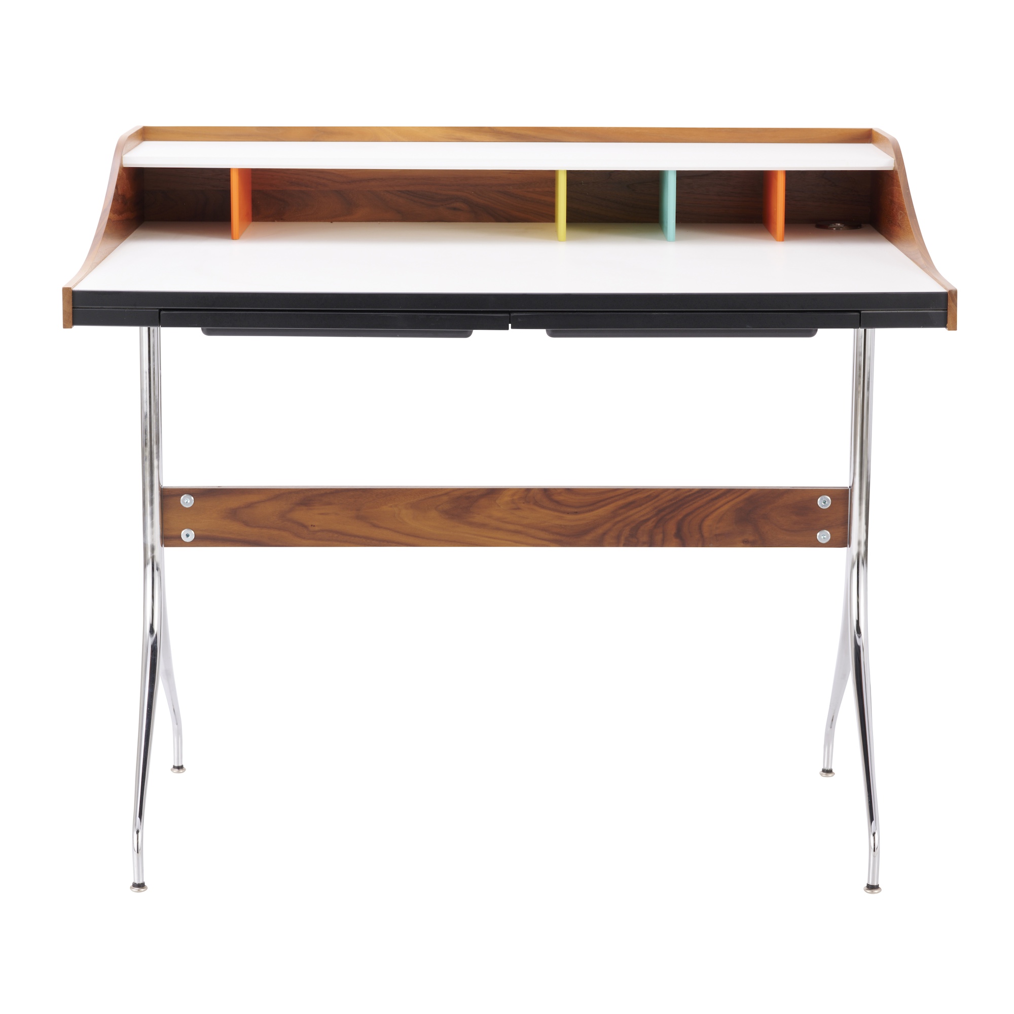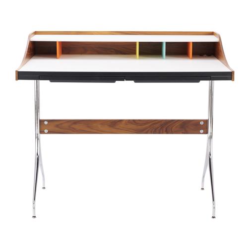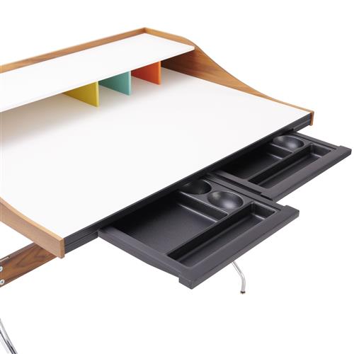 White laminate and walnut veneer top on chromed steel tube legs with a solid walnut stretcher. Two slide out stationery tray drawers. Coloured storage features to top.