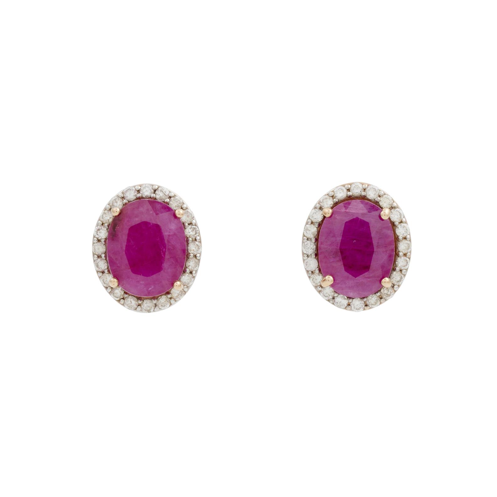 Each earring of cluster design, centring on an oval faceted ruby to a surround of brilliant cut diamonds, the rubies together weighing approximately 6.83 carats, the diamonds together weighing approximately 0.55 carats, to post and butterfly fittings, length 13.5 x 11.5 mm, gross weight approximately 4.79 grams.