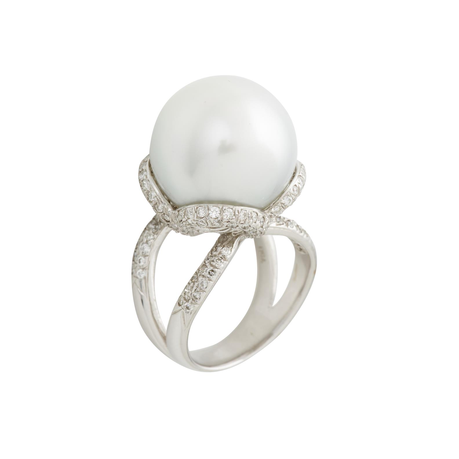 Centring on a round, white South Sea pearl measuring approximately 15.5mm set atop a stylised pave set diamond floral basket consisting of four overlapped petals to a pave set diamond split shoulder and plain reverse tapered band. ring size K,