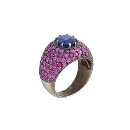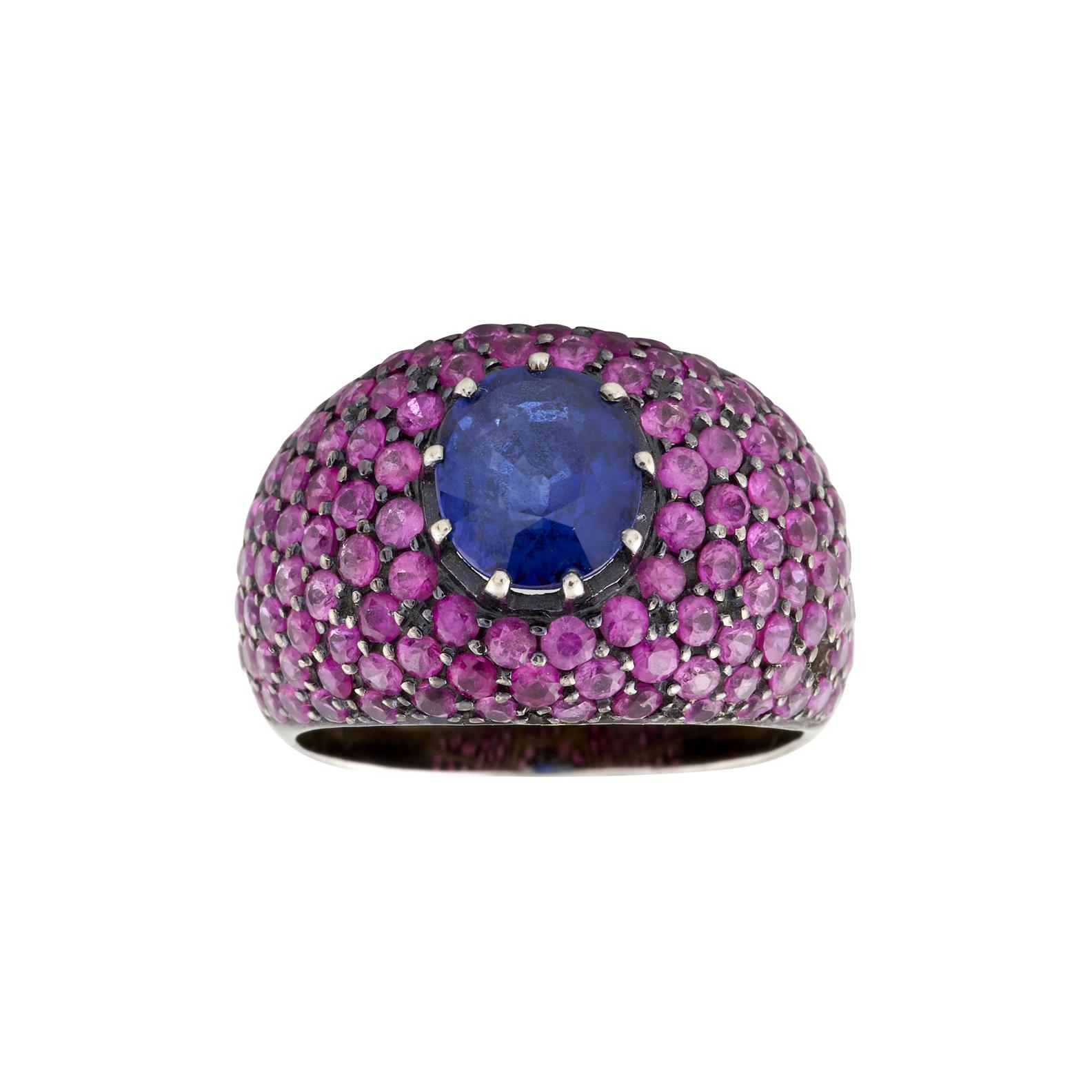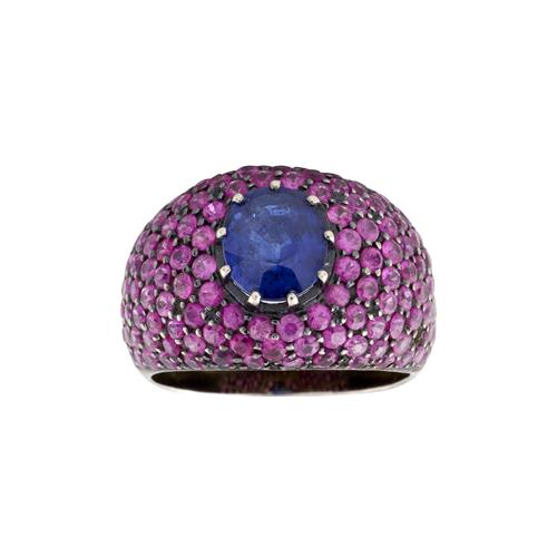 Of distinct bombe tapered design, the ring centres on a multi claw set royal blue oval brilliant cut blue sapphire, surrounded by pave set fuschia pink sapphires, finished with a black rhodium plating, size M,