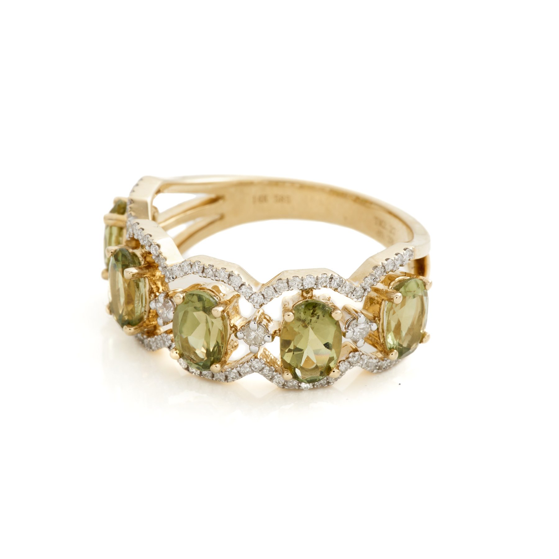 A TOURMALINE AND DIAMOND DRESS RING IN 14CT GOLD, THE LIGHT GREEN TOURMALINES TOTALLING 2.2CTS, WITH DIAMONDS TOTALLING APPROXIMATELY 0.28CTS, SIZE O, 4.3GMS