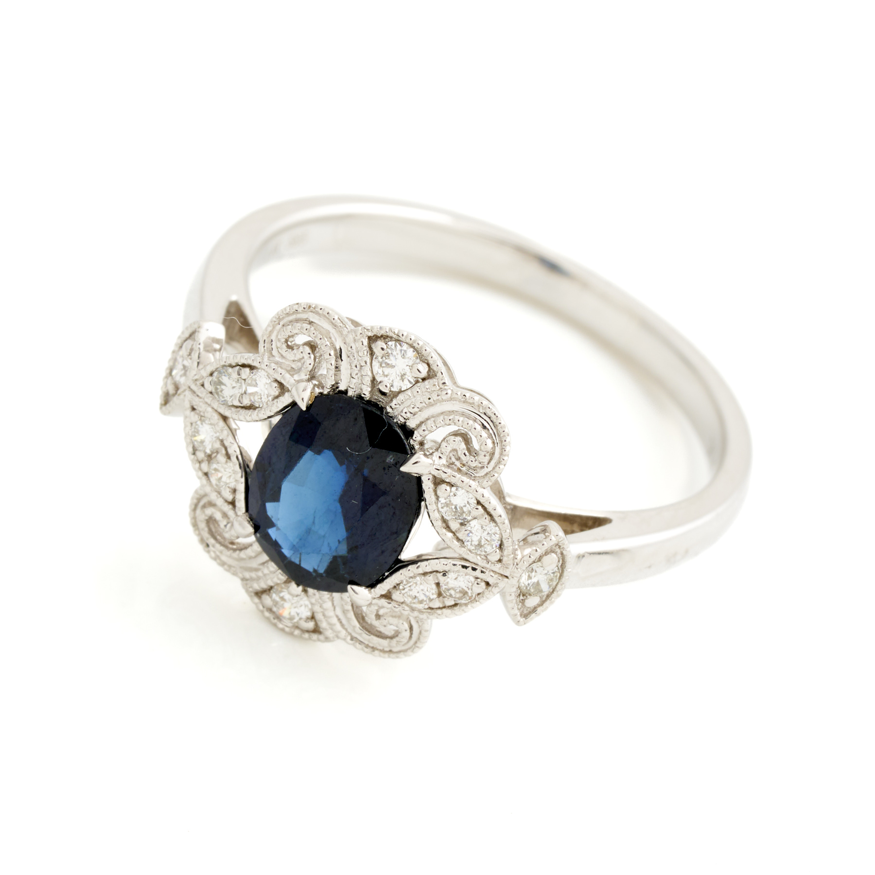 A SAPPHIRE AND DIAMOND RING IN 14CT WHITE GOLD, SAPPHIRE WEIGHING 1.07CT, SIZE M, 2.6GMS