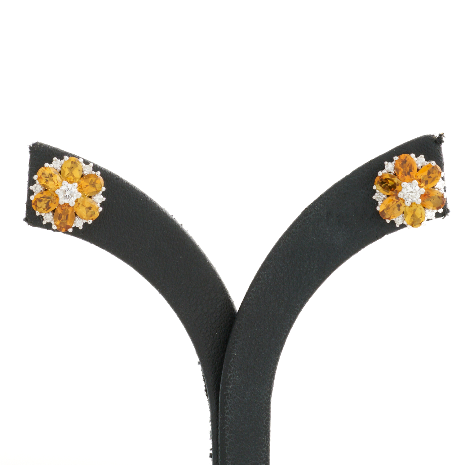 A PAIR OF TOURMALINE AND DIAMOND FLORAL STUD EARRINGS IN 14CT WHITE GOLD, THE ORANGE TOURMALINES TOTALLING 1.94CTS, WITH DIAMONDS TOTALLING 0.30CTS, TO POST AND BUTTERFLY FITTINGS, 10MM DIAMETER, 2.8GMS