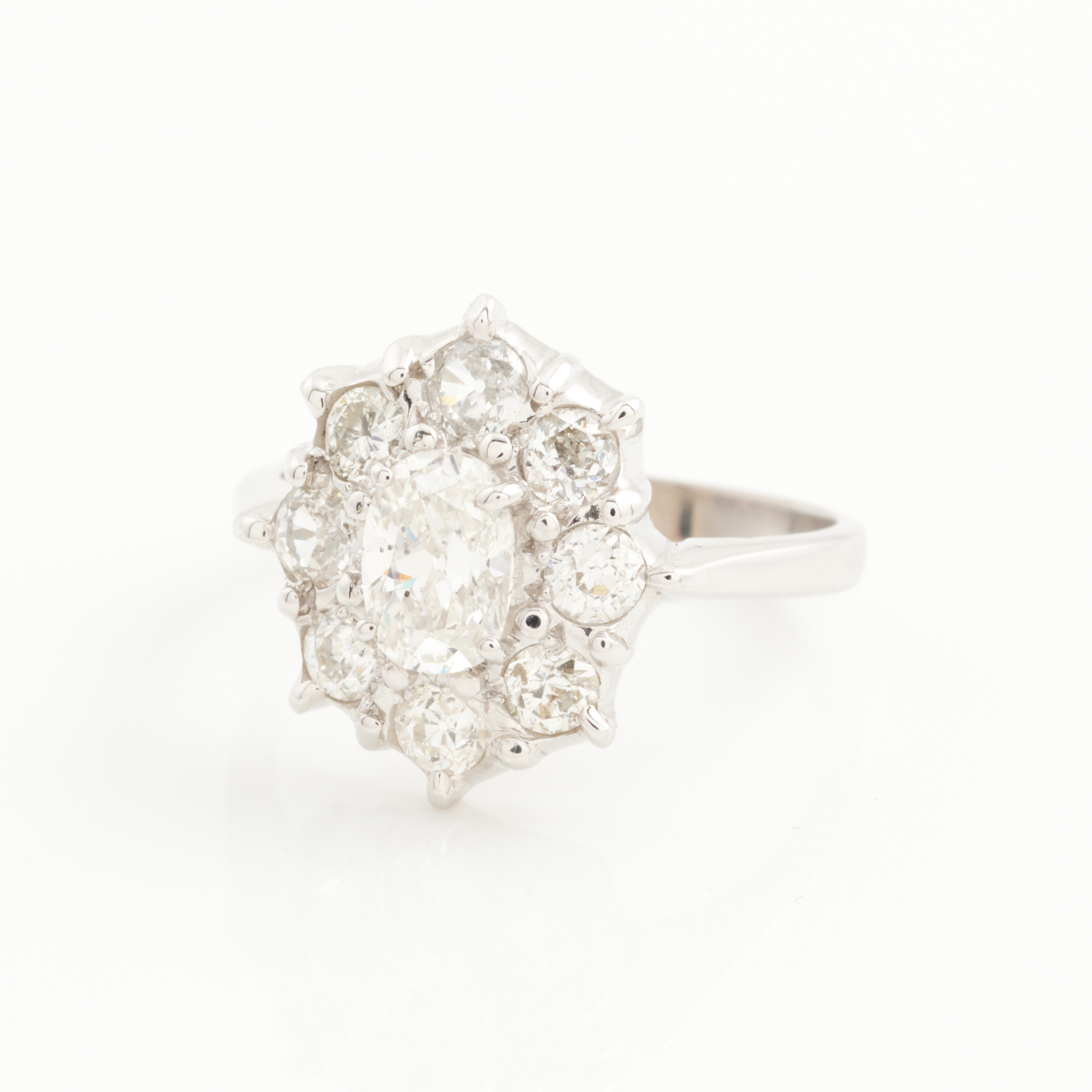 A DIAMOND CLUSTER RING IN 18CT WHITE GOLD, THE DIAMONDS TOTALLING APPROXIMATELY 1.38CTS, SIZE K, 3.8GMS