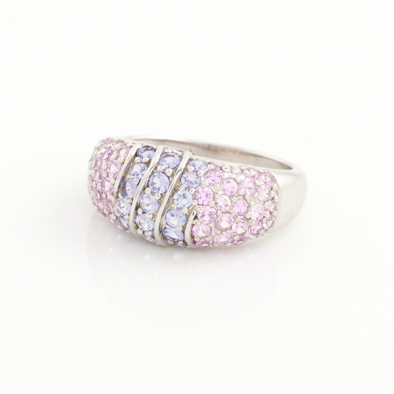 A PINK TOPAZ AND TANZANITE RING IN 9CT WHITE GOLD, SIZE M1/2, 4.01GMS