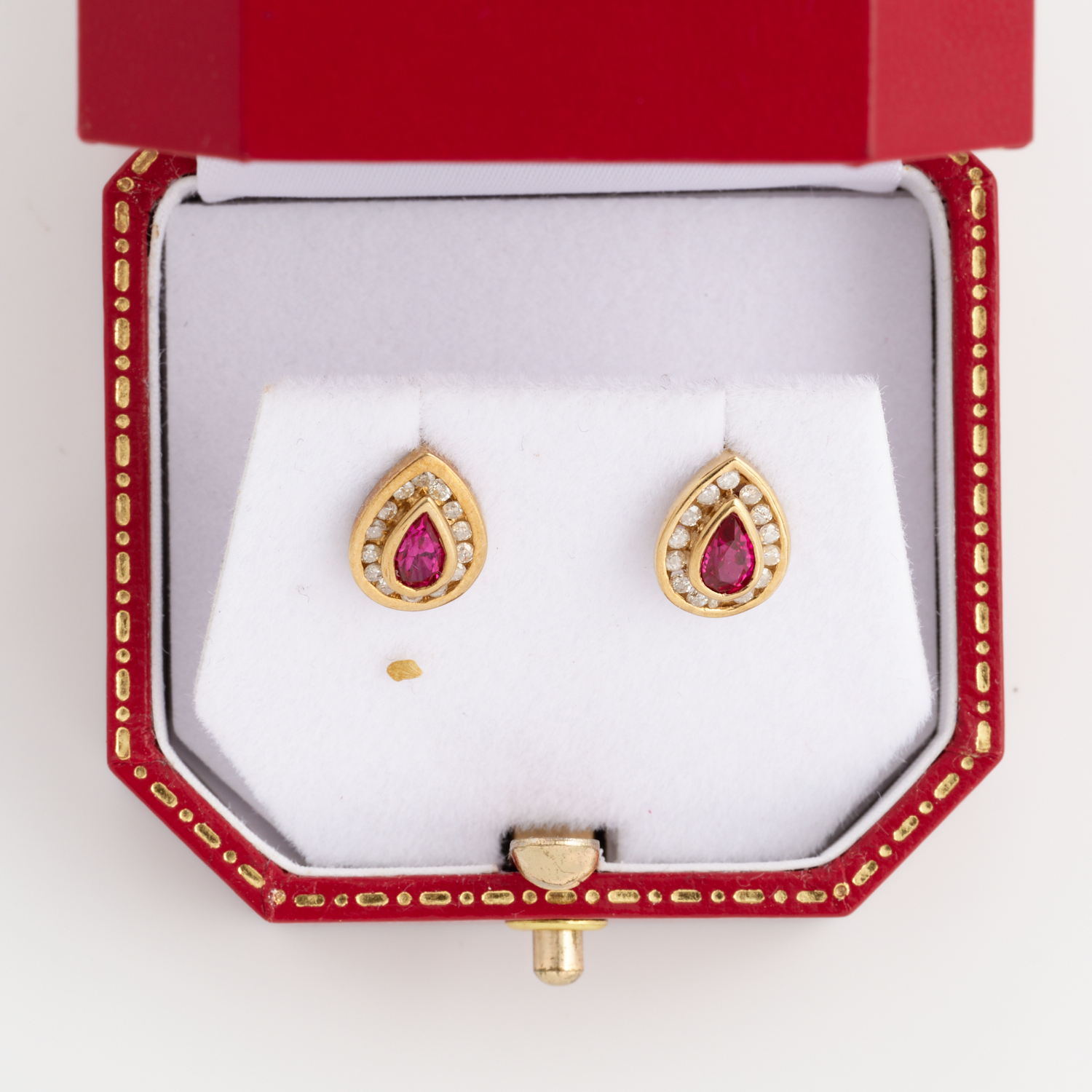 A PAIR OF SYNTHETIC RUBY AND DIAMOND EARRINGS IN 9CT GOLD, 10MM, ACCOMPANIED BY A BOX