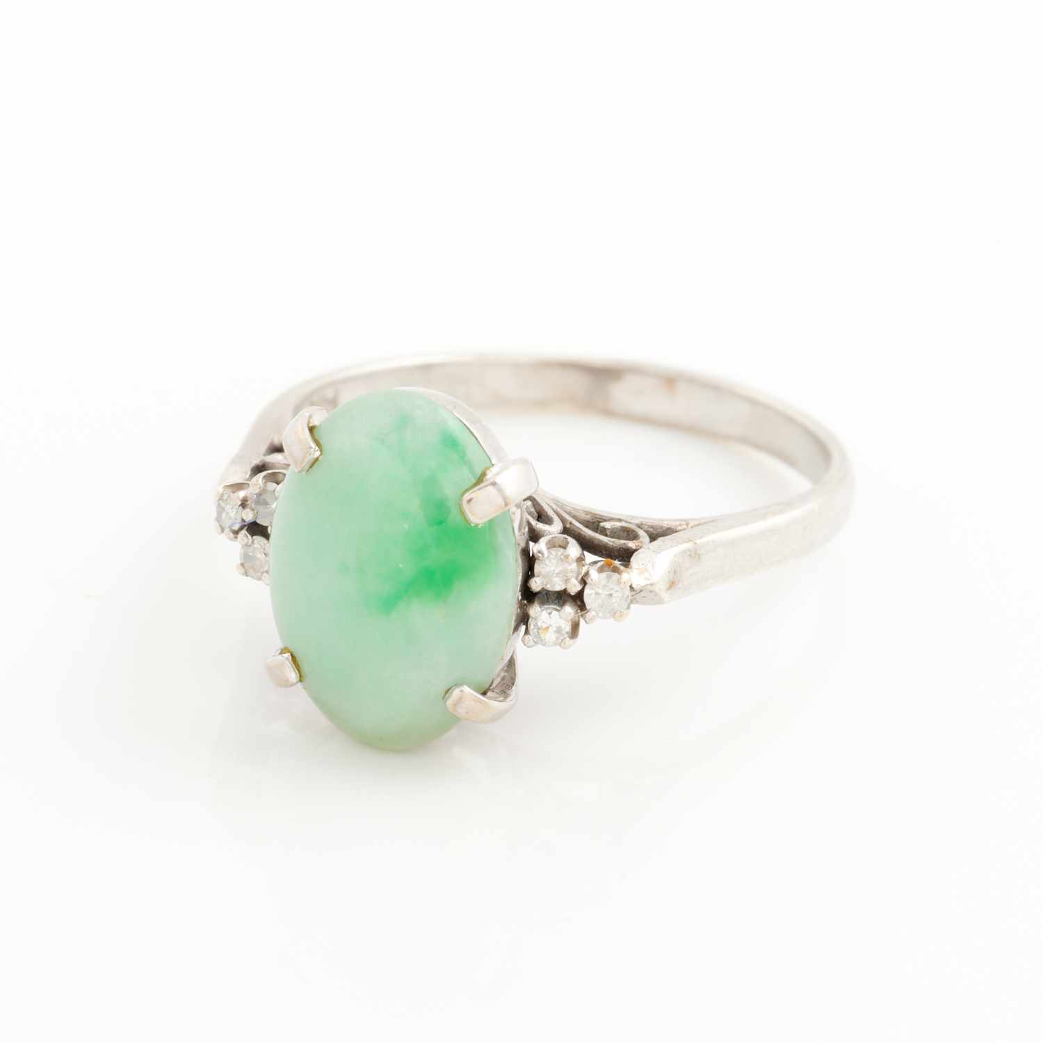 A JADE AND DIAMOND RING IN STERLING SILVER, SIZE Q
