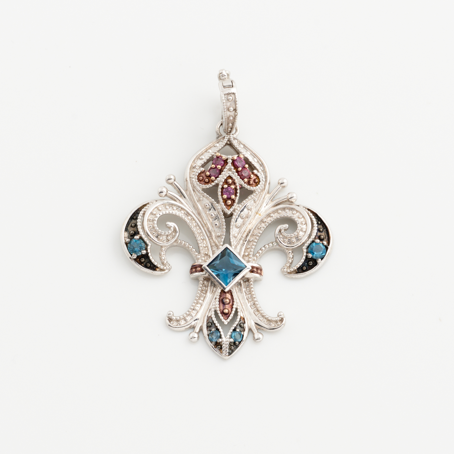 A TOPAZ AND GARNET FLEUR-DE-LYS ENHANCER PENDANT IN STERLING SILVER, 50 X 35MM