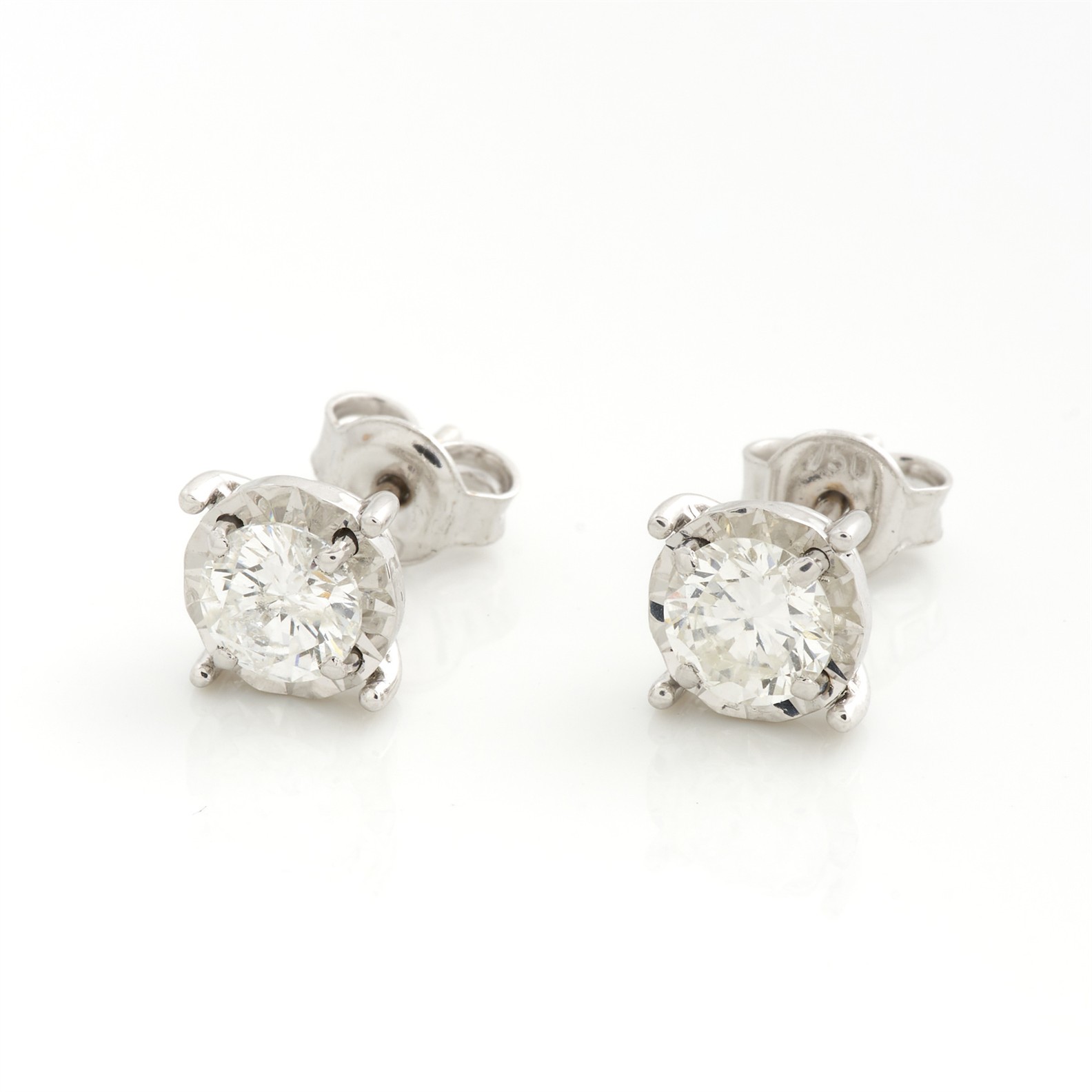 A PAIR OF DIAMOND EARRINGS IN 18CT WHITE GOLD, THE DIAMONDS TOTALLING APPROXIMATELY 1.28CTS (F-G/SI-I1), TO POST AND BUTTERFLY FITTINGS, 6MM X 6MM, 2.1GMS