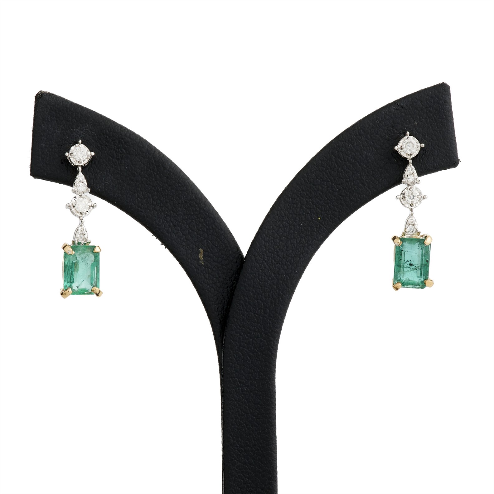 A PAIR OF EMERALD AND DIAMOND EARRINGS IN 18CT TWO-TONE GOLD, EACH EMERALD WEIGHING APPROXIMATELY 0.50CTS, TO POST AND BUTTERFLY FITTINGS, 21MM, 2.6GMS