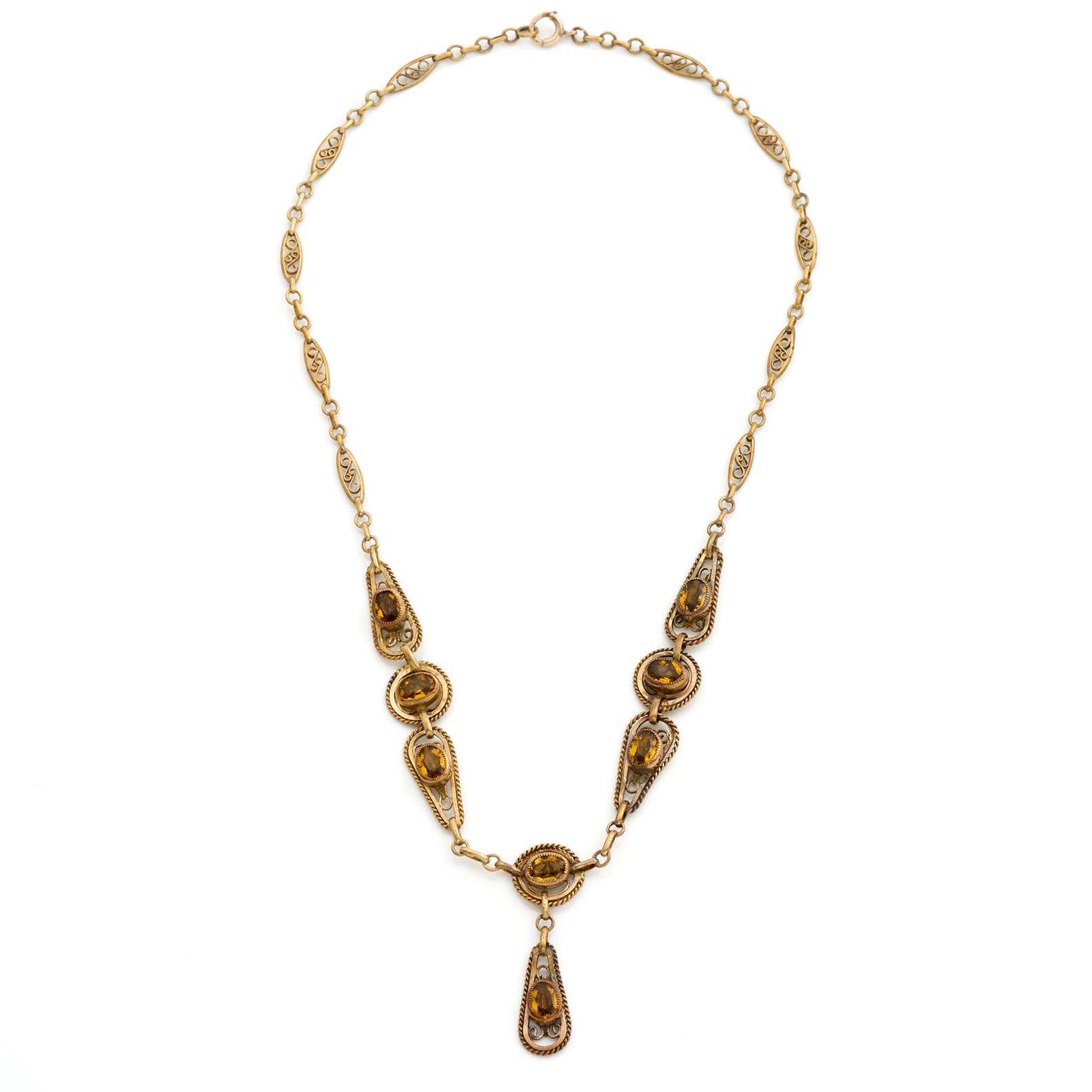 AN EDWARDIAN ORANGE GEM FILIGREE NECKLACE IN ROLLED GOLD, 400MM