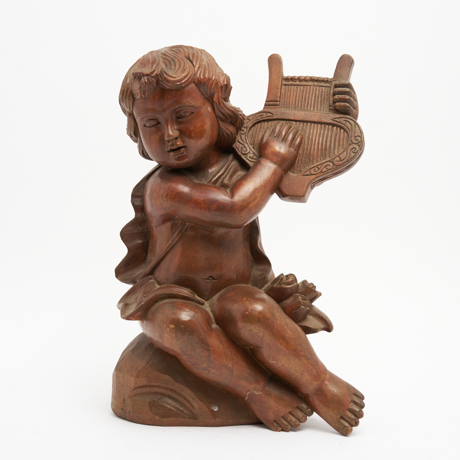 A CARVED WOODEN SCULPTURE OF AN ANGEL WITH LYRE (A/F)