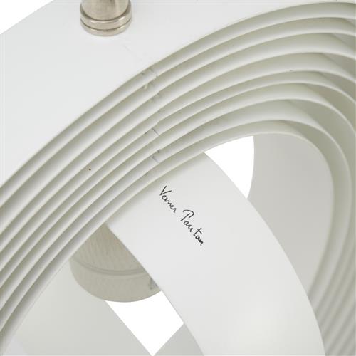 Loops of white lacquered metal blades fan around globe. Manufacturer mark present.