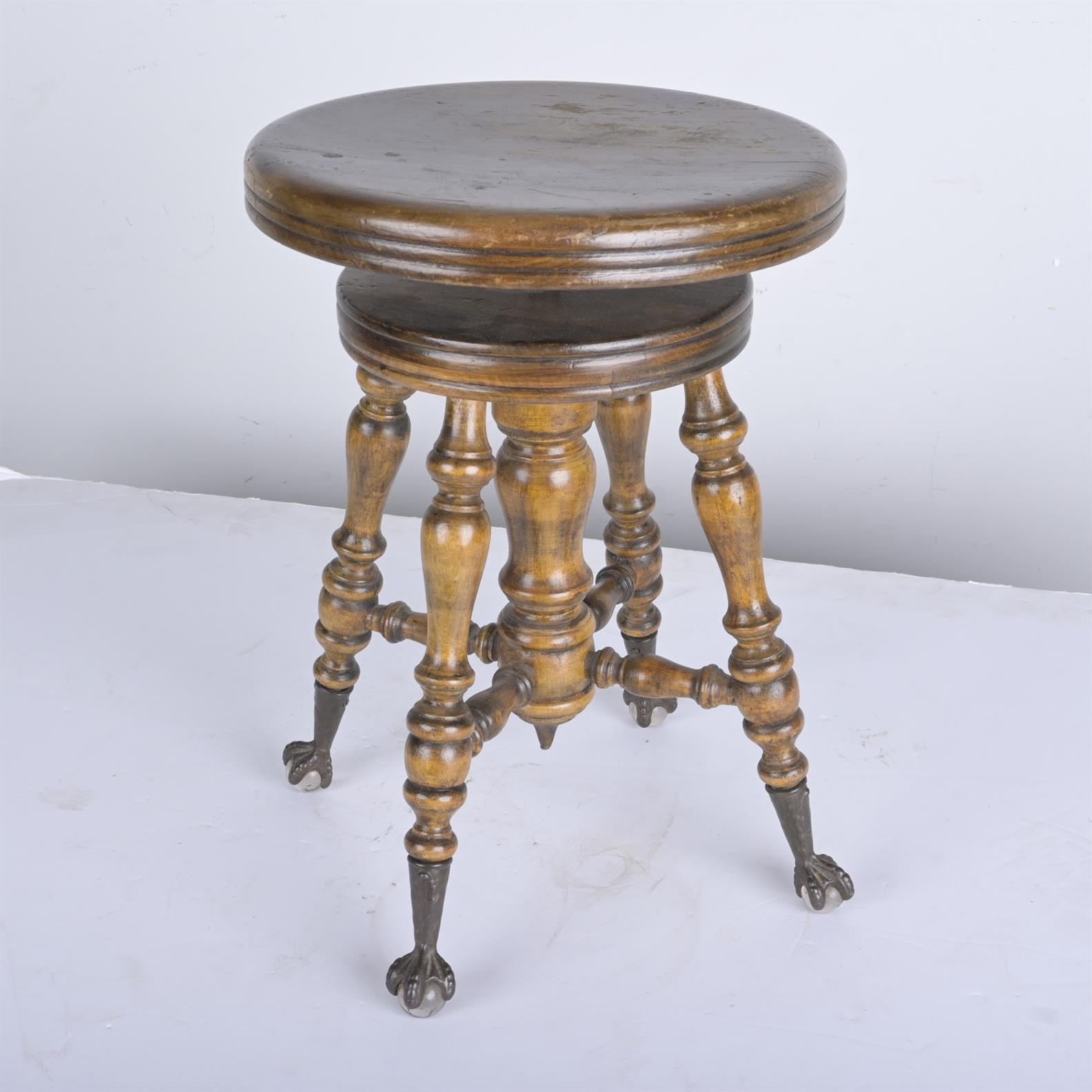 A LATE 19th CENTURY HARDWOOD ADJUSTABLE REVOLVING PIANO STOOL (A/F) (51H X 43DIA CM)