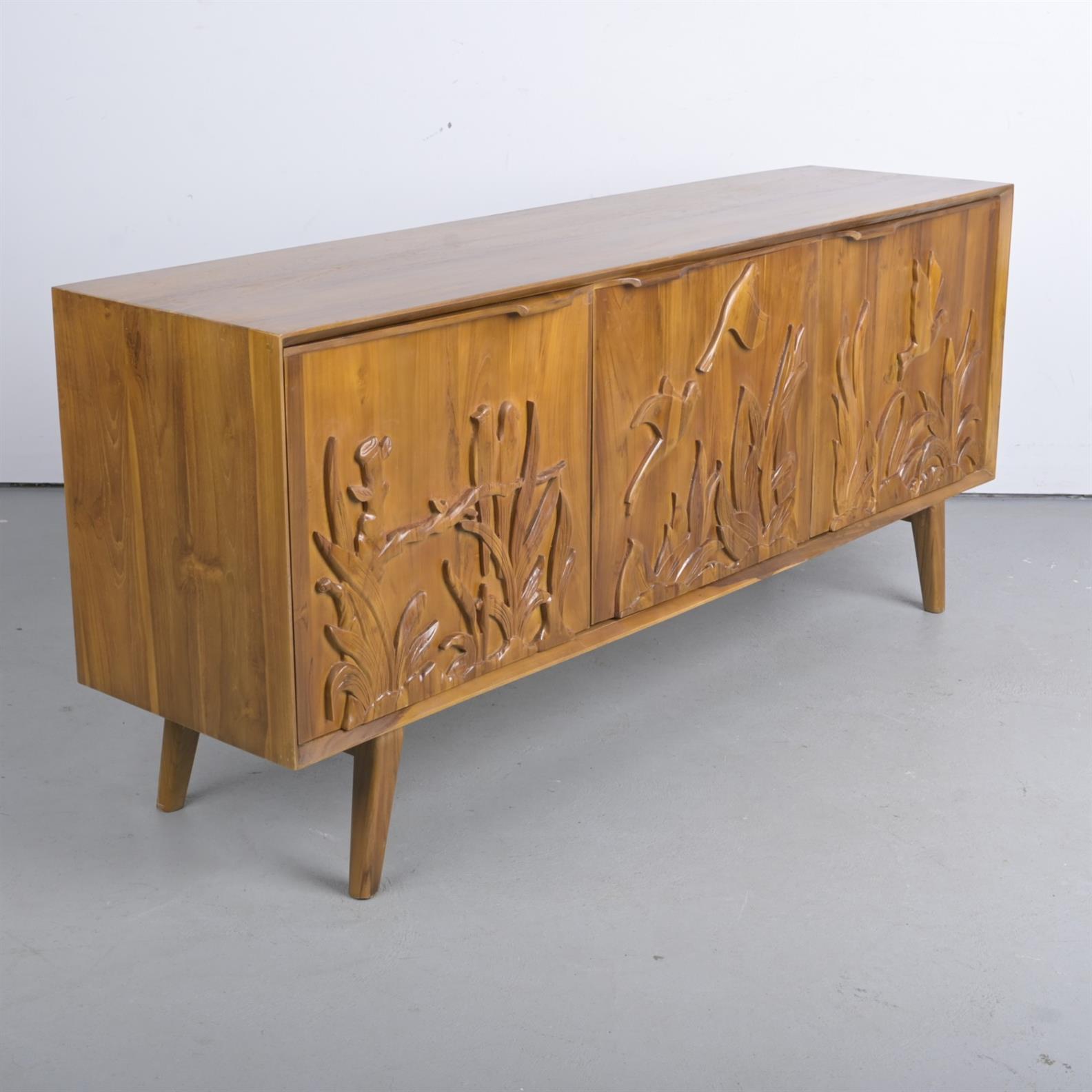A TEAK SIDEBOARD WITH CARVING DETAIL (71H X 160W X 40D CM) (THIS ITEM MUST BE REMOVED BY CARRIERS AT THE CUSTOMER'S EXPENSE. LEONARD JOEL STAFF CANNOT ASSIST CARRYING THIS ITEM)