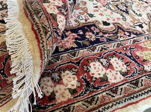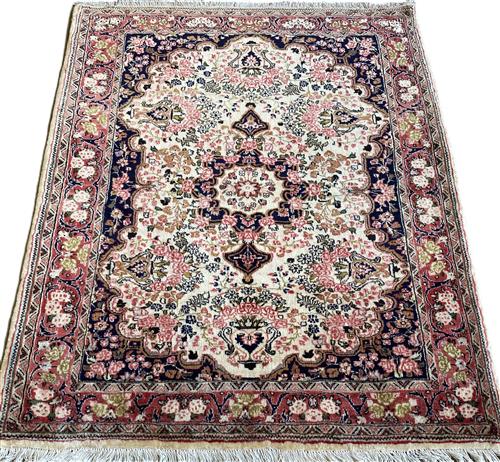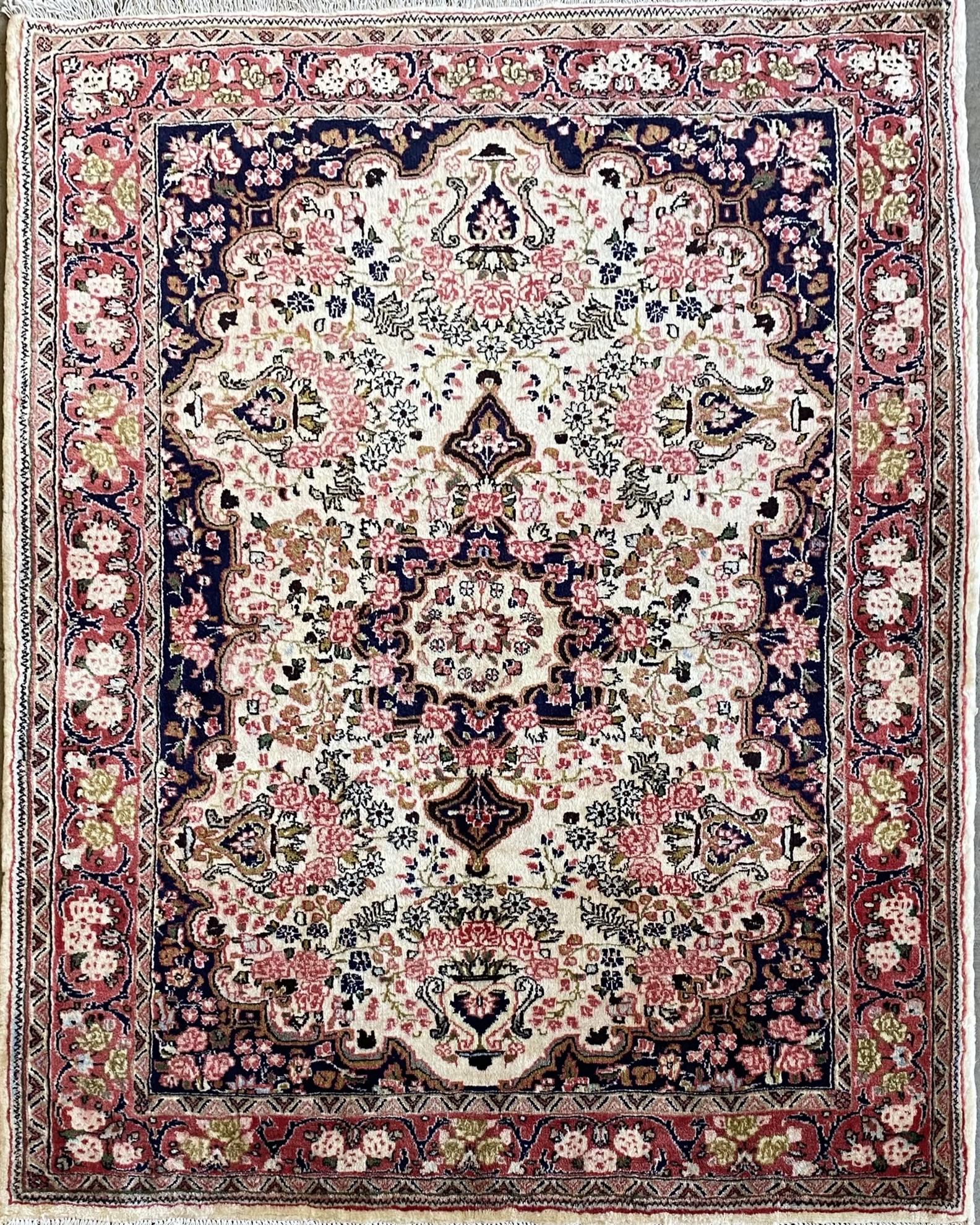 A FINELY HAND-KNOTTED PERSIAN BIDJAR RUG, 100% LAMB'S WOOL PILE. CITY WEAVE FROM THE WESTERN KURDISTAN PROVINCE WITH A COMPACT DENSE PILE. CLASSIC PERSIAN DESIGN OF CENTRAL MEDALLION OF FLORAL GULFARANG ROSE MOTIFS IN A CREAM FIELD OF SYMMETRICAL VASES BEARING GULFARANG ROSES & FLORAL FOLIAGE. DARKER TONED INNER BORDER AND RED-TONED BORDER OF GULFARANG ROSES. CERTIFICATE OF AUTHENTICITY & ORIGIN ON REQUEST. SIZE: 145 X 115 CM – ORIGIN: IRAN (PLEASE NOTE THERE MAY BE SOME COLOUR VARIATION FROM PHOTOGRAPH)
