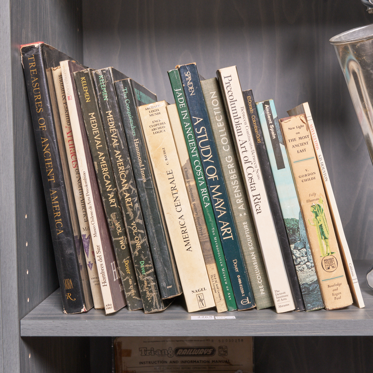 A PART SHELF OF REFERENCE BOOKS CONCERNING ANCIENT SOUTH AMERICAN CIVILIZATIONS INCLUDING AMERICA CENTRALE, AND TREASURES OF ANCIENT AMERICA, AND ARENSBERG COLLECTION