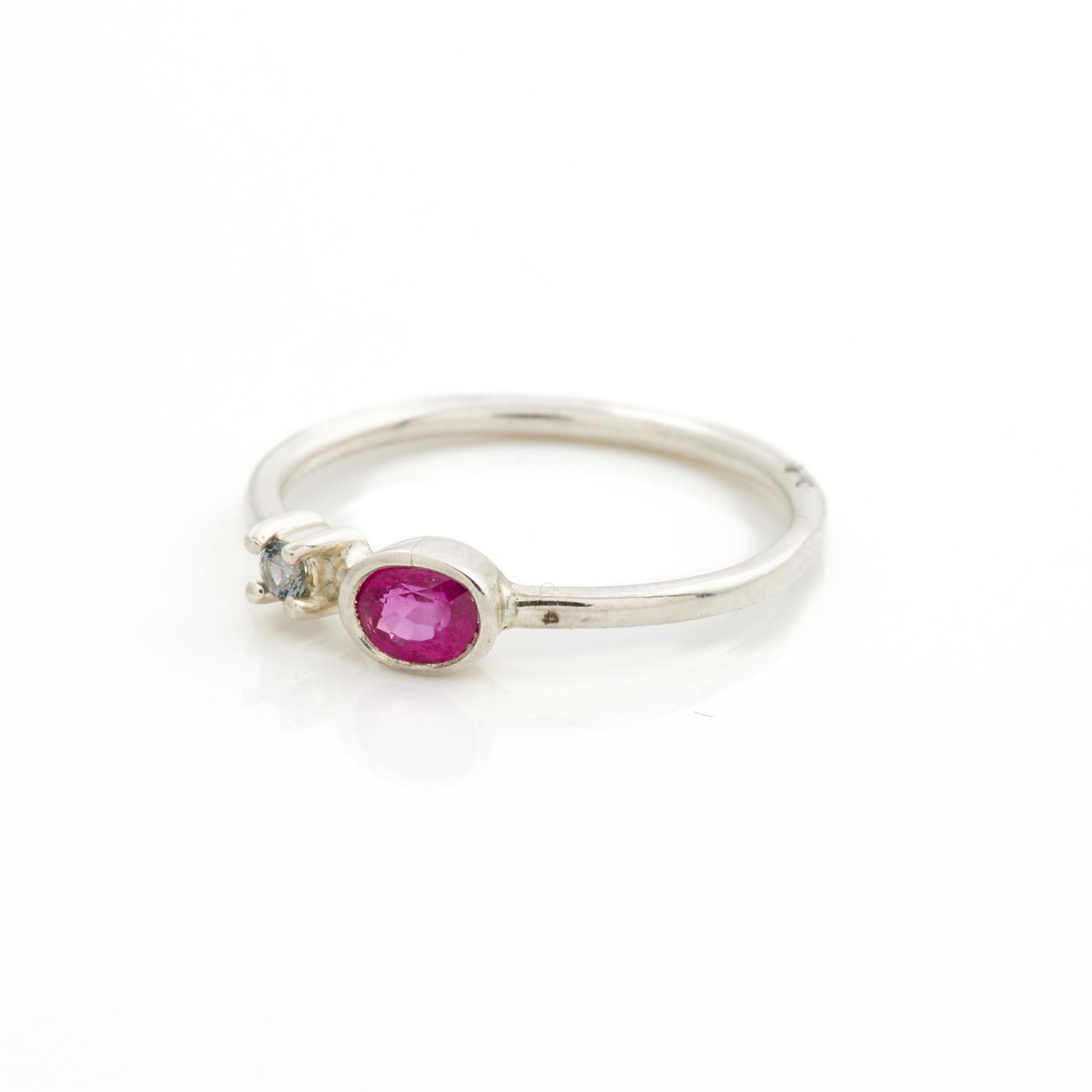 A RUBY AND DIAMOND RING IN 18CT WHITE GOLD, SIZE O, 1.4GMS
