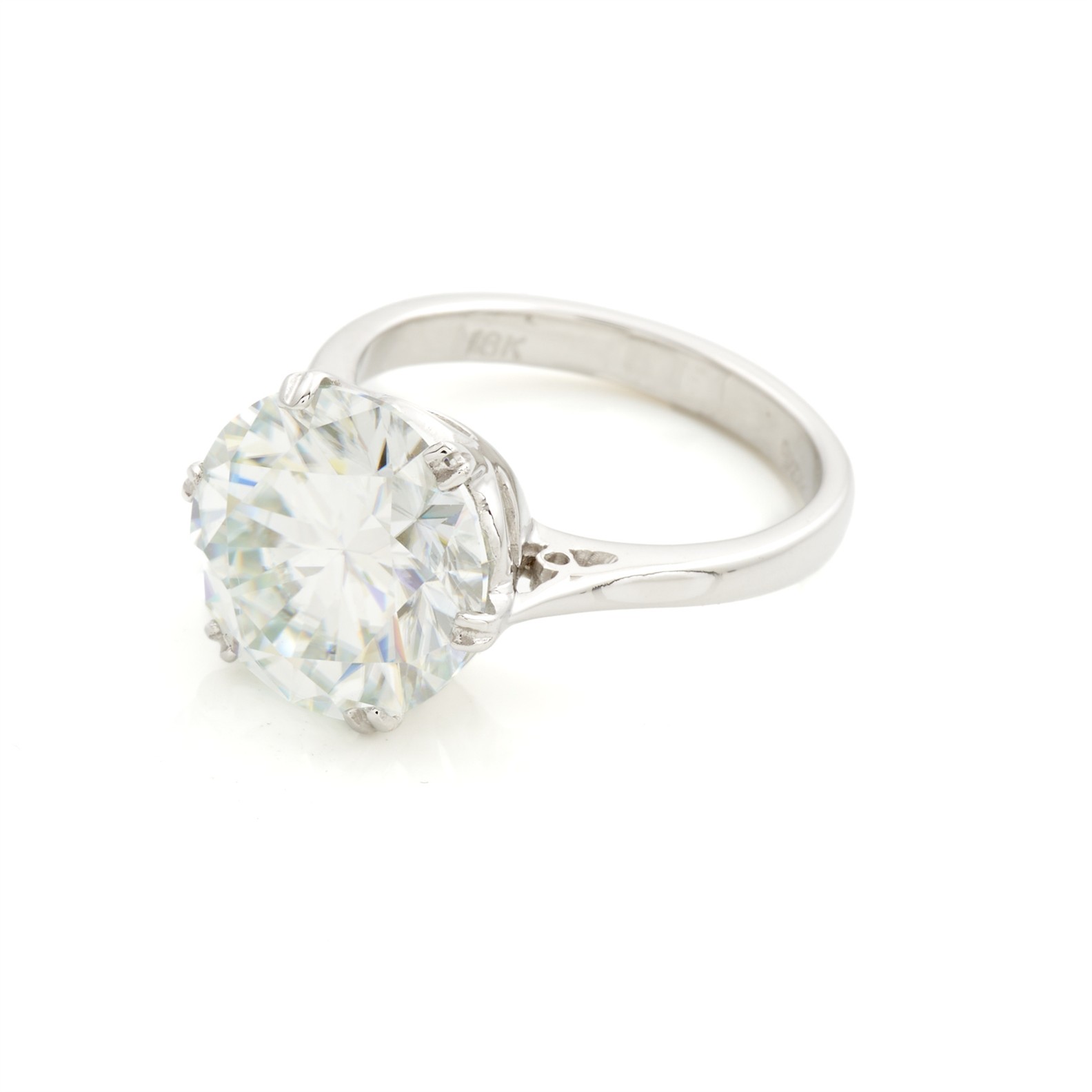 A MOISSANITE RING IN 18CT WHITE GOLD, THE MOISSANITE WEIGHING 6.18CTS, SIZE N, 5.6GMS