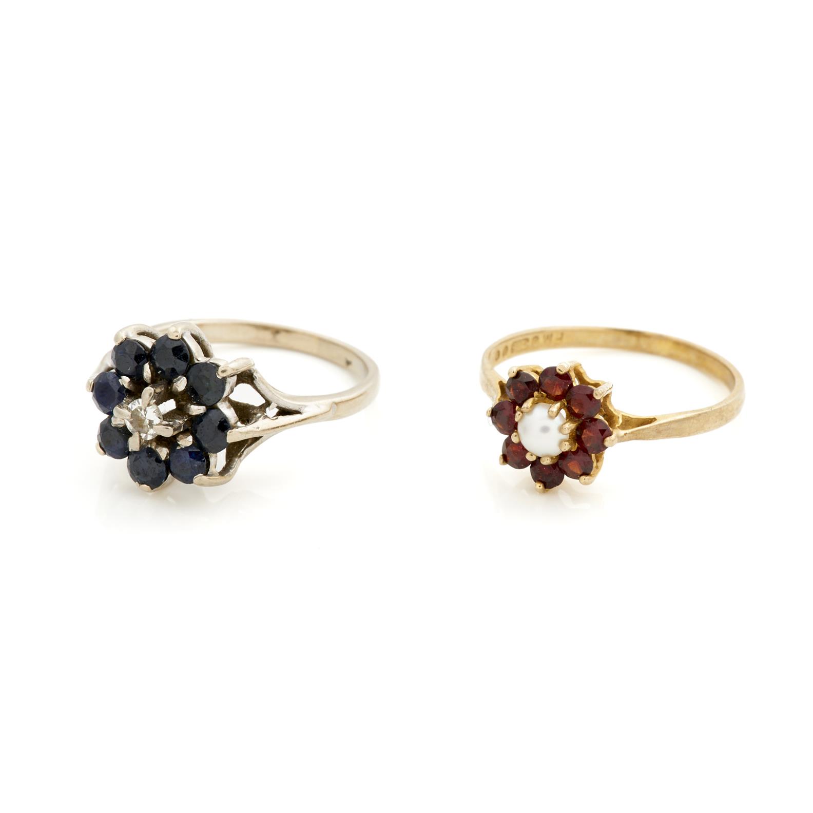 A PAIR OF GEM SET CLUSTER RINGS IN 9CT GOLD, SIZE K - L 1/2, 5.2GMS