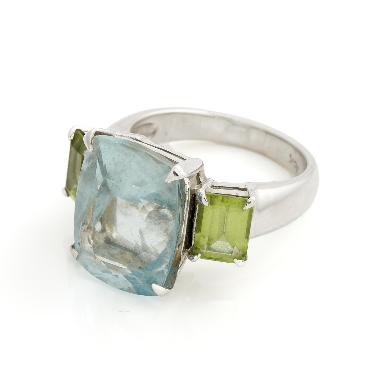 AN AQUAMARINE AND PERIDOT DIAMOND RING IN 18CT WHITE GOLD, THE AQUAMARINE WEIGHING 9.0CTS, WITH PERIDOT TOTALLING 2.0CTS, SIZE N