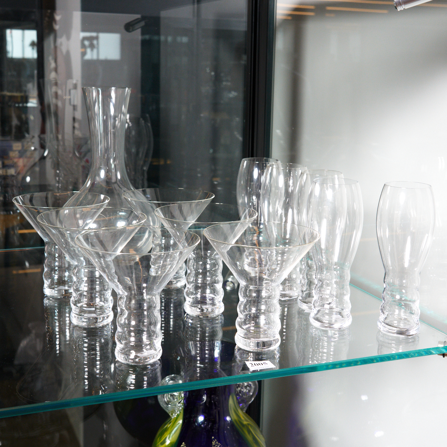 A SET OF POST MODERN RIEDEL MARTINI AND HIGHBALL GLASSES WITH A CARAFE, MADE IN AUSTRIA H.24.5 (CARAFE)