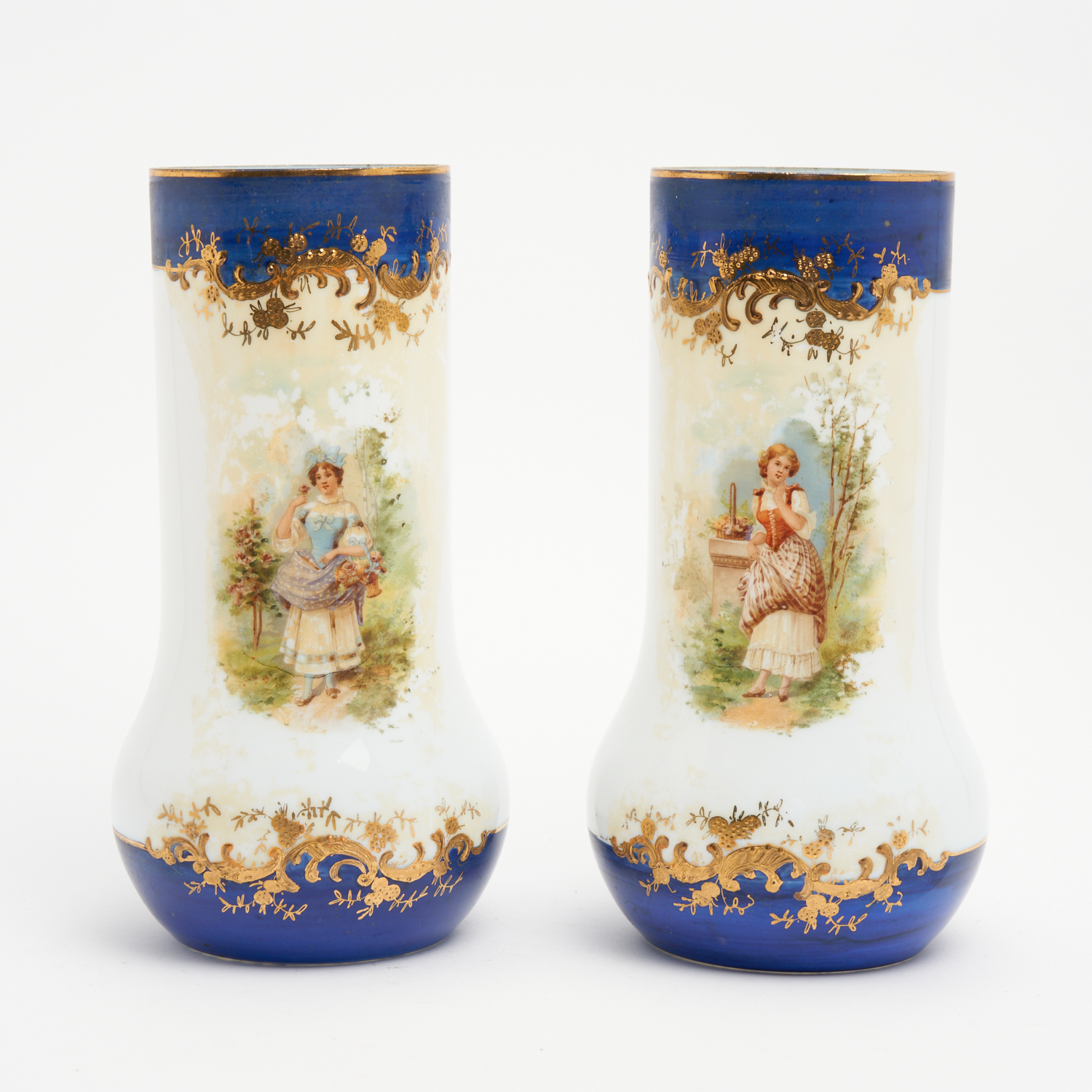 A PAIR OF MILK GLASS VASES WITH HAND PAINTED ENAMEL SCENES (29.5H CM)
