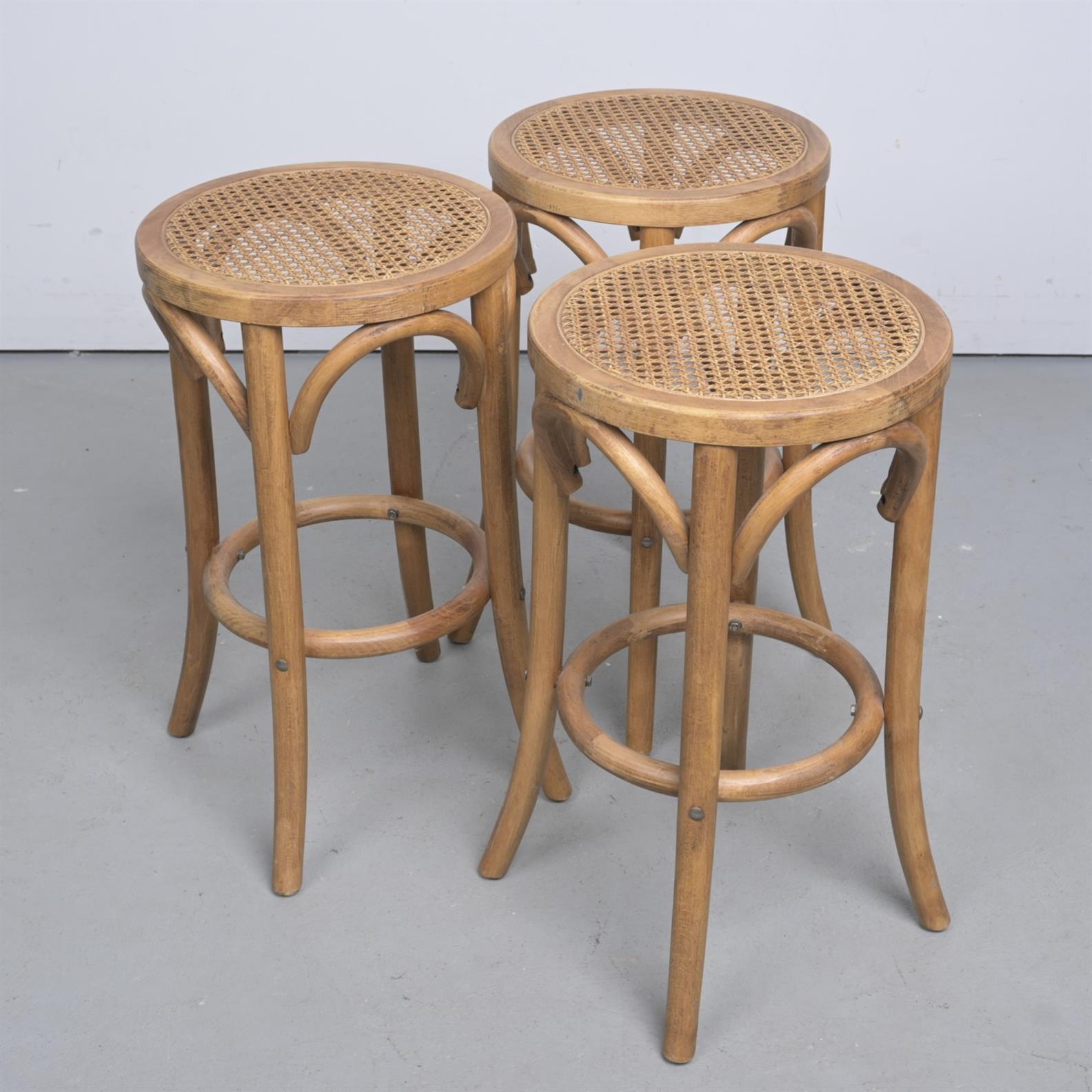 A SET OF THREE TIMBER AND WOVEN CANE STOOLS (63H X 38D CM)