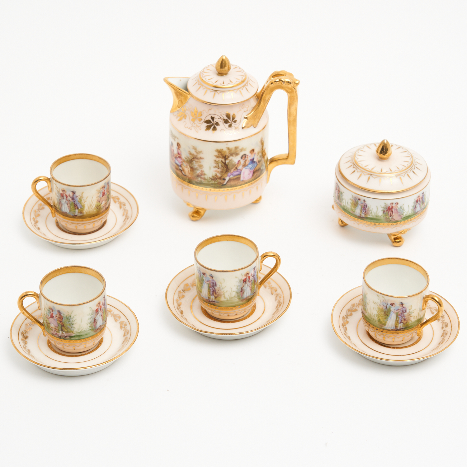 A ROYAL VIENNA PORCELAIN COFFEE SERVICE WITH GILDED HIGHLIGHTS AND PAINTED SCENES H.13.5CM
