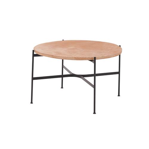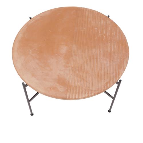 Circular terracotta table top with machined linear design supported by black enamelled rod base.