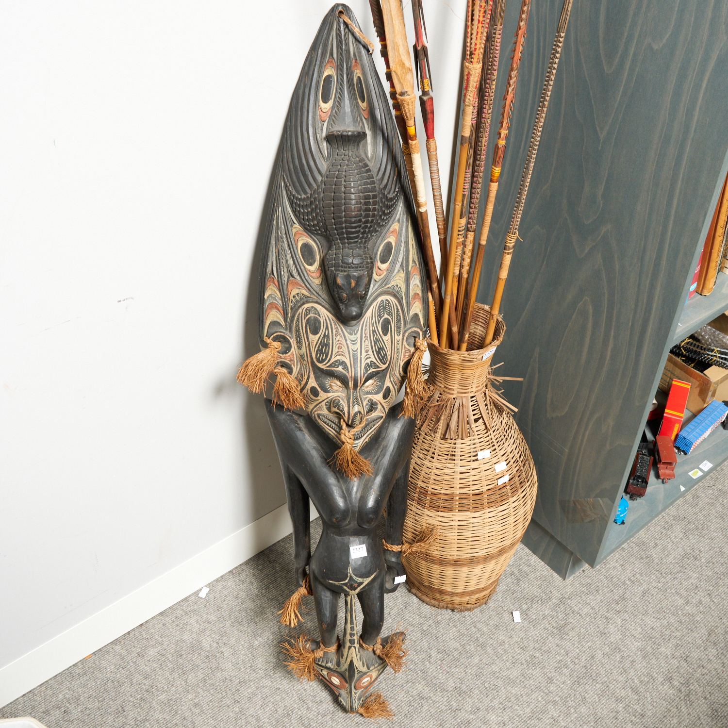 A 1970'S PAPUA NEW GUINEAN FEMALE FIGURE WITH CROCODILE HEADDRESS H.110CM