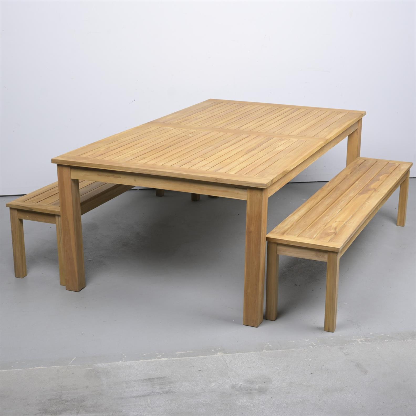 A NEW THREE-PIECE TEAK OUTDOOR DINING SETTING (75H X 210W X 120D CM) (THIS ITEM MUST BE REMOVED BY CARRIERS AT THE CUSTOMER'S EXPENSE. LEONARD JOEL STAFF CANNOT ASSIST CARRYING THIS ITEM)