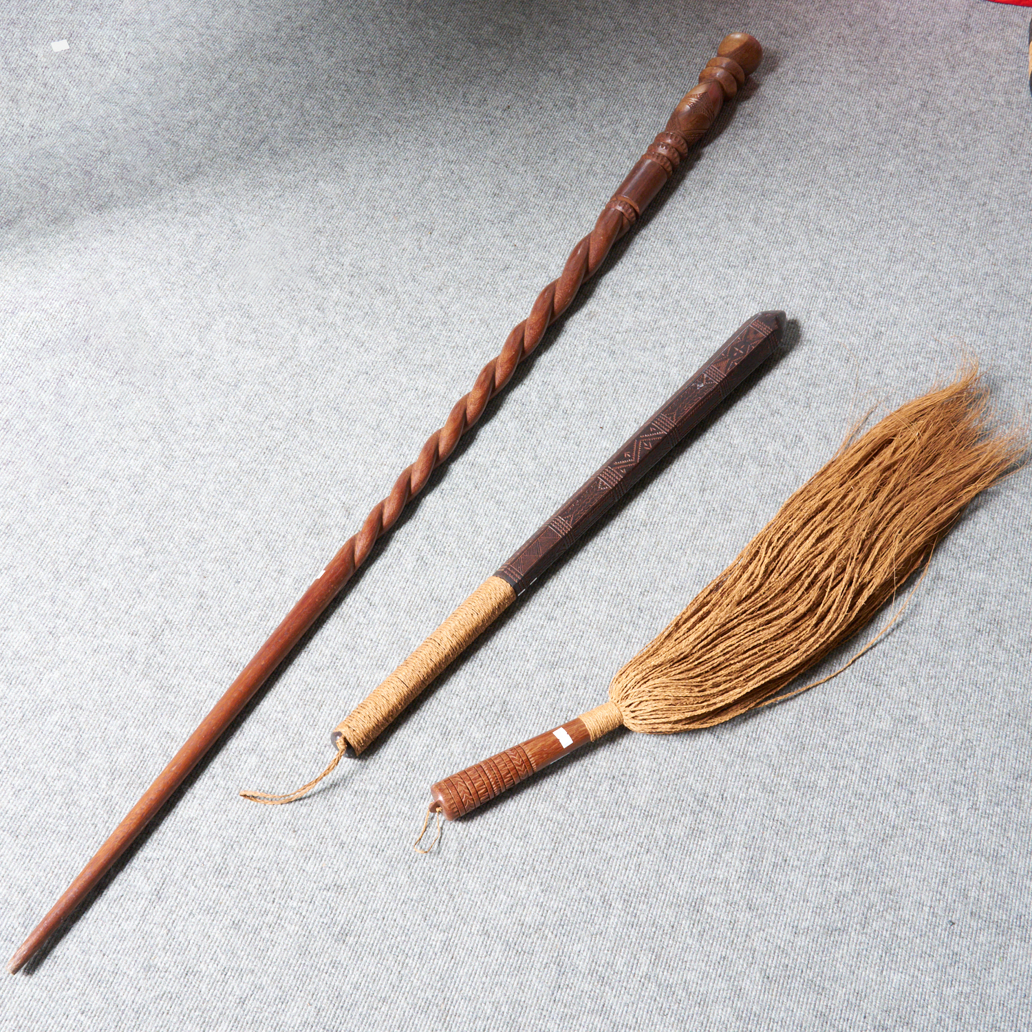 A SAMOAN WAR CLUB WITH BOUND HANDLE TOGETHER WITH A SAMOAN STAFF AND WHISK H.169CM (STAFF) Provenance: Collection of Bob Lyon, receiver of the highest civilian award in Fiji, Samoa, and Papua New Guinea. Note: The club was presented to Bob when he was inducted with his chiefly title in Samoa