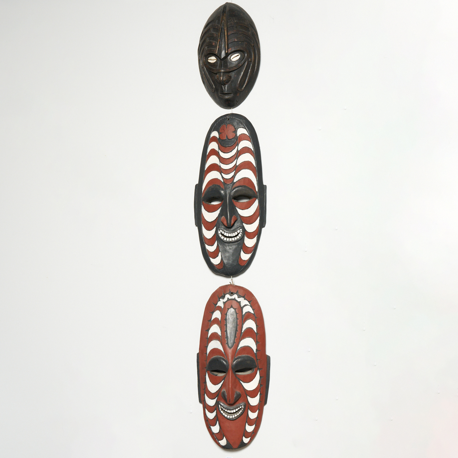A GROUP OF THREE PAPUA NEW GUINEAN MASKS INCLUDING A 1980S SHELL FACE MASK, AND TWO MORE RECENT MULTICOLOURED FACE MASKS H.75CM (TALLEST)