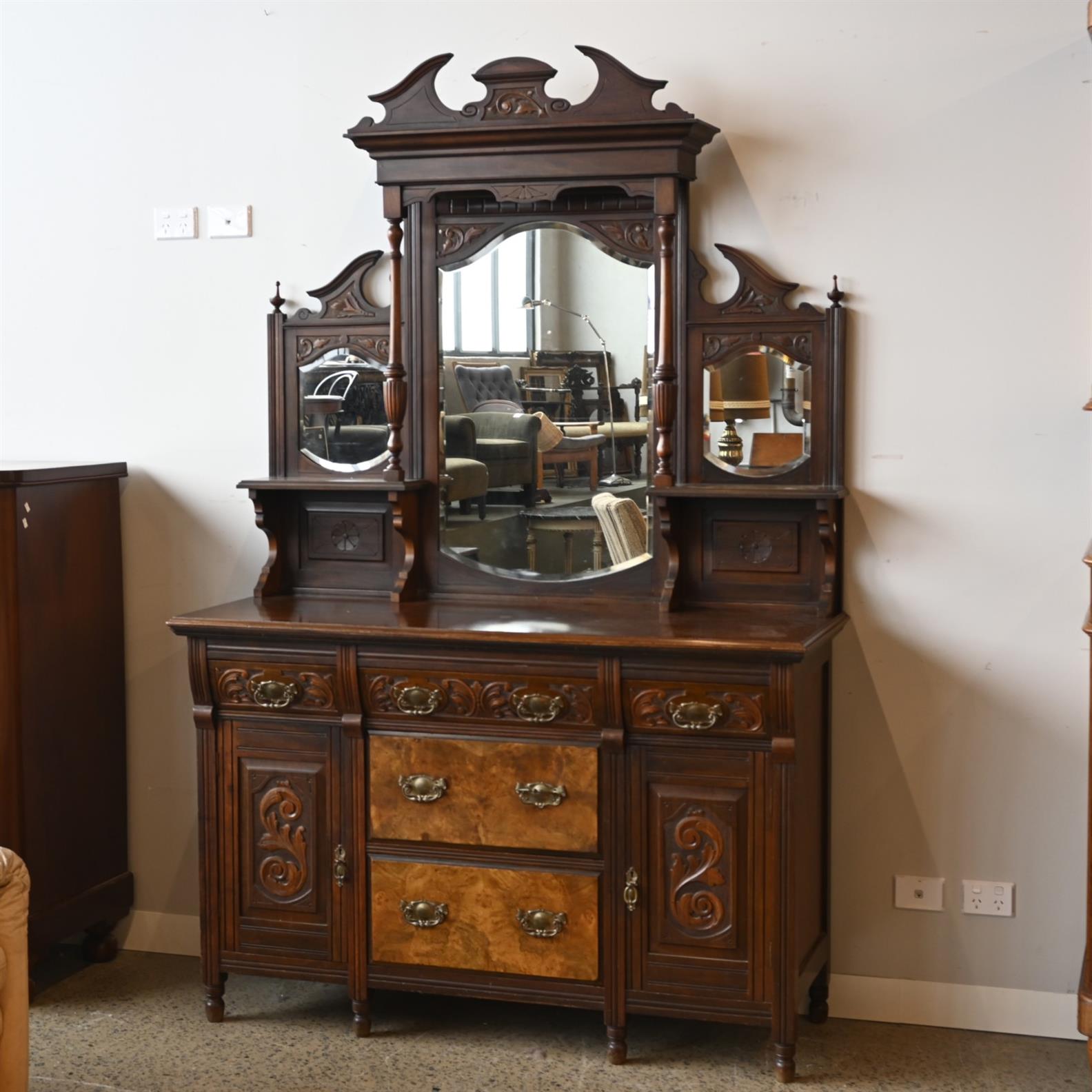 A LATE VICTORIAN MAHOGANY AND WALNUT SIDEBOARD (220H X 141W 53D CM) (THIS ITEM MUST BE REMOVED BY CARRIERS AT THE CUSTOMER'S EXPENSE. LEONARD JOEL STAFF CANNOT ASSIST CARRYING THIS ITEM)
